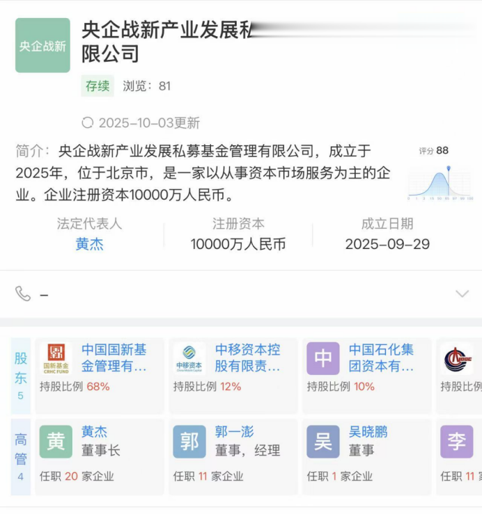 央企战新产业发展私募基金管理有限公司成立日期为2025年9月29日,经营范围包括私募股权投资基金管理以及创业投资基金管理服务。