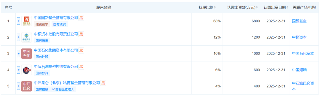 据天眼查,该公司的股东包括中国国新旗下的中国国新基金管理有限公司(持股68%)、中国移动旗下的中移资本控股有限责任公司(持股12%)、中国石化集团资本有限公司(持股10%)、中海石油投资控股有限公司(持股6%),以及中国石油旗下的中油昆仑(北京)私募基金管理有限公司(持股4%)。