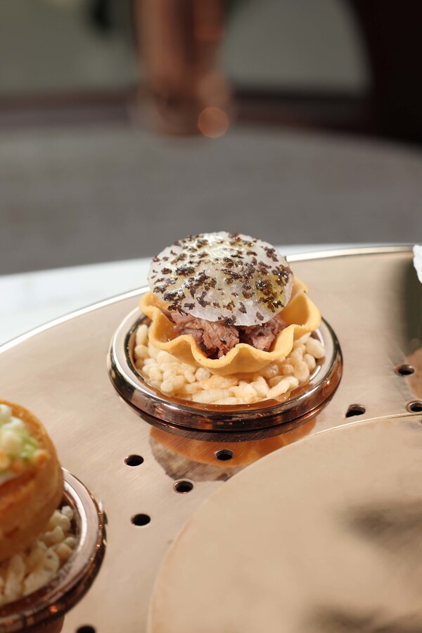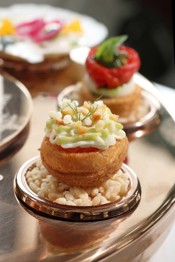 甜点篇章宛如一场秋日的奇幻舞会。榛子2.0将坚果的醇香层层堆叠,仿佛林间木气的回响;香槟威廉梨轻盈闪烁,犹如金色气泡定格在果园的风中;伯爵蒙布朗以茶香重塑经典,栗香在舌尖化作温润诗句;乌龙香草杏子交织东方茶韵与果实柔情;玄米茶柚子千层酥则以酥脆层叠映衬柑橘清新,宛若清风拂过稻田,带来一曲果茶和鸣。