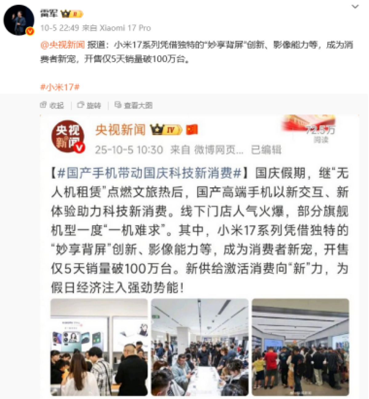 关于手机背屏的设计是否鸡肋,小米17系列的销量已给出答案。10月5日,雷军转发了央视新闻发布的微博。并提到小米17系列开售仅5天销量突破100万台。雷军随后进一步透露,带“妙享背屏”的小米17ProMax不仅单独刷新纪录,更占据了该系列超过一半的销量。