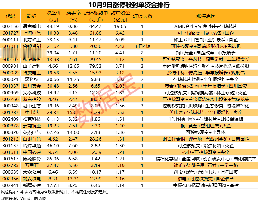 以封单金额计算,29股封单资金均超1亿元,通富微电、上海电气、北方稀土封单资金居前,分别为19.65亿元、6.42亿元、6.09亿元。