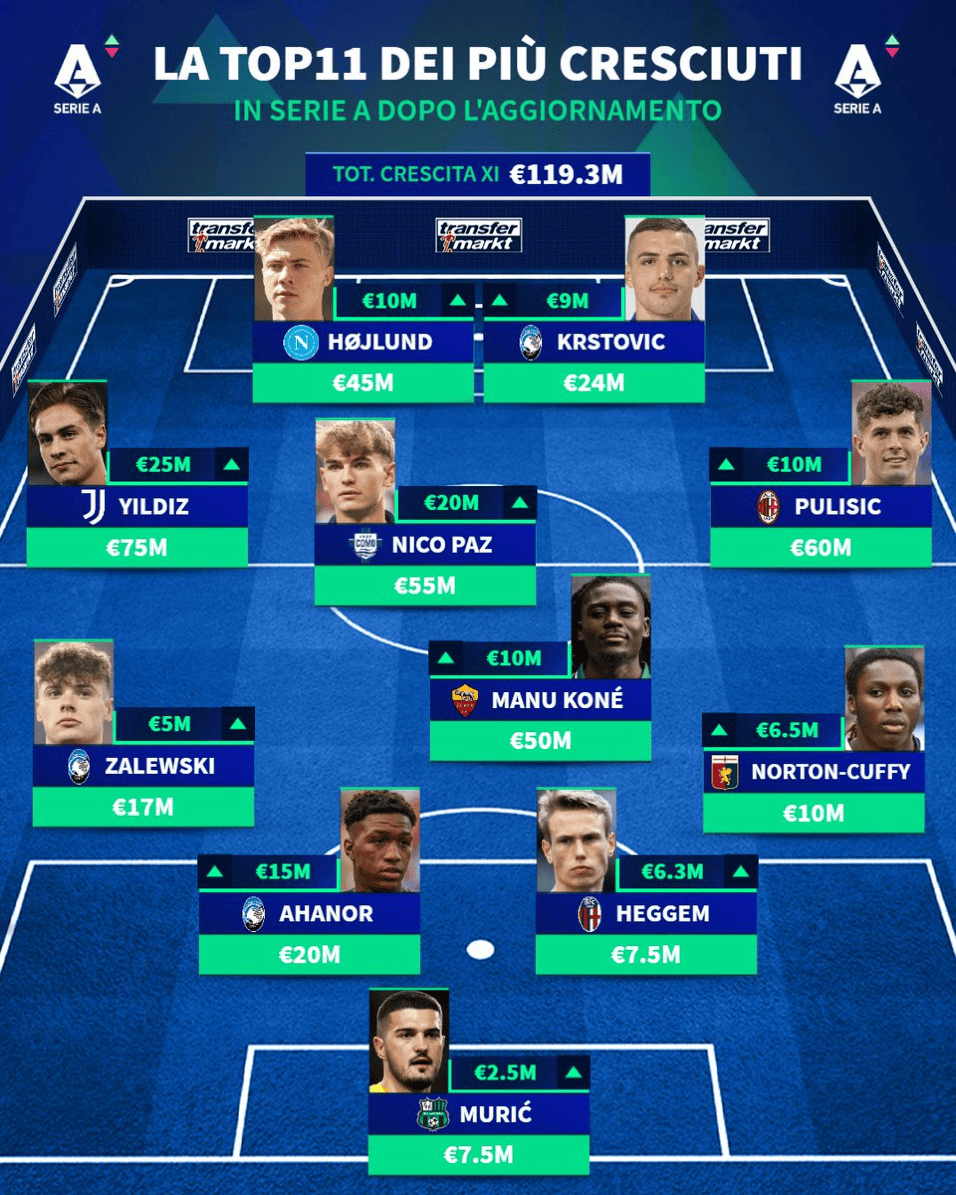 虎扑10月09日讯德国转会市场近期更新了意甲球员的身价,并将身价涨幅最多的球员组成了一套11人阵容。