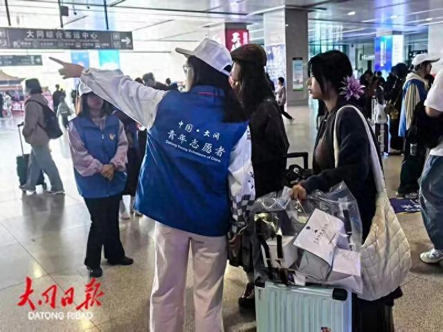 国庆中秋假期,团市委联合市青年志愿者协会组织一批青年志愿者,分组在大同火车站、大同南站、云冈国际机场为旅客提供问询指引、文明劝导、困难帮扶、旅游推广、应急保障等志愿服务,用实际行动为来同游客保驾护航。