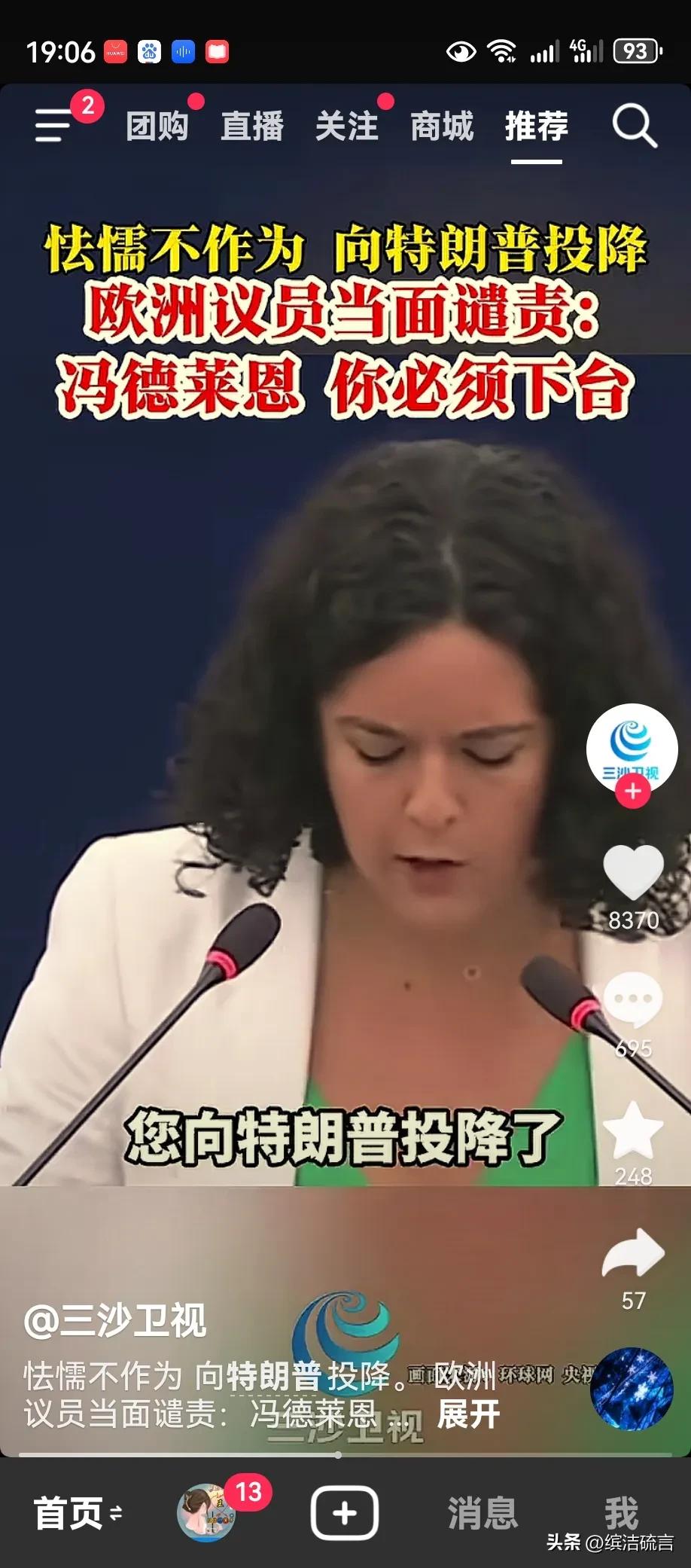 欧盟主席冯德莱恩太惨了,估计是她当主席以来最受伤的时候,也是最憋屈的时候吧! 昨天在欧盟会议上,一名议员当着众多国家议员对冯德莱恩进行批评和指责,认为冯德莱恩是无能和对美国的支持。 冯德莱恩全程板着脸,默默的被羞辱,看样子她这个主席时间不久矣,已经引起了多国不满,与美国签订协议也没有与欧盟相关国家进行磋商。大家认为冯德莱恩还能当多久欧盟主席?