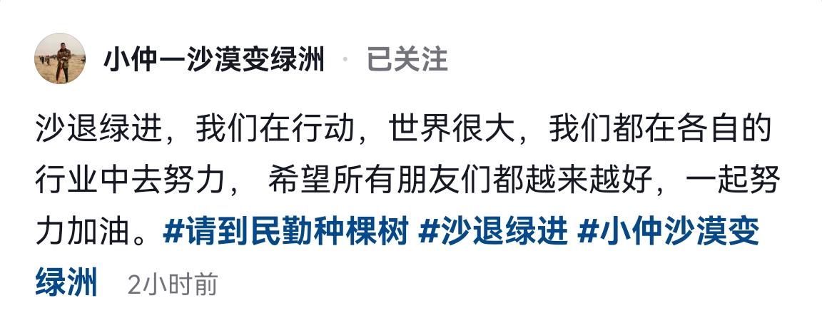 10月9日,甘肃民勤返乡创业青年仲麟发文说:“沙退绿进,我们在行动。世界很大,我们都在各自行业中努力。希望所有朋友们都越来越好,一起努力加油。” 这个vlog是仲麟结婚期间拍摄的,小童、王一凯、豪士少爷以及一些新农人都去参加了他的婚礼。 赵小童是十个勤天中比较特别的一位,他既有才艺,又充满浪漫气息,而且不骄不躁特别务实。 赵小童无时无刻都在用自己的影响力和热度去宣传甘肃民勤,民勤有现在的成绩,应有小童的一份功劳。 小童已经去民勤3次了,第一次和十个勤天兄弟们一起去,第二次带发小王一凯和好朋友申同学一起去,第三次是去参加仲麟婚礼。 其中,王一凯去了3次民勤,豪士小少爷都去了2次民勤,有一次十个勤天爸爸妈妈去民勤就是他俩带队。 现在的民勤已是许多志愿者打卡的地方,沙漠营地设施也越来越齐全,有专门的淋浴间、洗衣机、厨房、宿舍等。 小童还和朋友们玩起了滑沙,他还和大家一起参观了营地,营地宿舍墙上画满了与小童相关的壁画。 最后,小童在木桩上写下寄语,他希望“沙漠变绿洲,民勤越来越好”。 我也祝小童的演艺事业越来越好,大家觉得呢?
