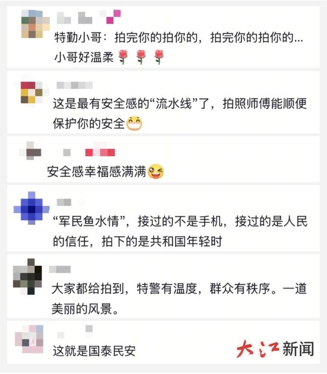 据了解,国庆期间,八一广场的执勤特警平均每天帮游客拍照1万多张。民警应孔明说“我们不会辜负大家的热情,在给大家拍照打卡的同时,也会尽全力维护好治安秩序给游客带来更好的游玩体验”。面对热情又耐心的民警,游客们赞不绝口,有人说,民警是景区“隐藏的拍照神器”,还有人说“这是最有安全感的摄影师”。