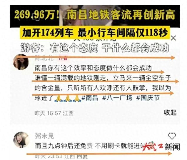 与此同时,南昌公安联动多方力量,在地铁站打出“越站疏导”“加开列车”的组合拳,全力疏解客流压力。10月1日当天,南昌地铁单日客流飙至269.96万人次,创下历史新高,客流强度1.68更是稳居全国第一。面对这样的“压力测试”,南昌市公安局地铁警察支队以多维度举措守护平安,网友纷纷点赞,高效背后的硬核守护,让这场盛会的结尾同样惊艳。