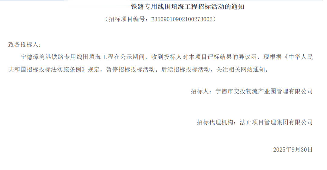 宁德漳湾港铁路专用线围填海工程在公示期间,收到投标人对本项目评标结果的异议函,现根据《中华人民共和国招标投标法实施条例》规定,暂停招标投标活动。后续招标投标活动,关注相关网站通知。