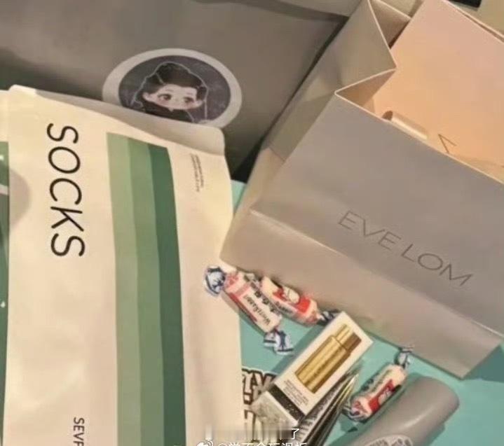 李沁追剧团伴手礼好豪华李沁追剧团伴手礼真不错品牌袋子、洗发水、奶糖再加上袜子袜子