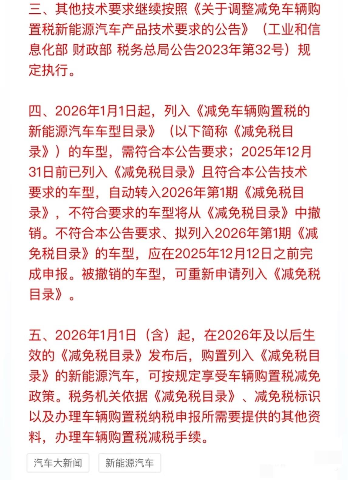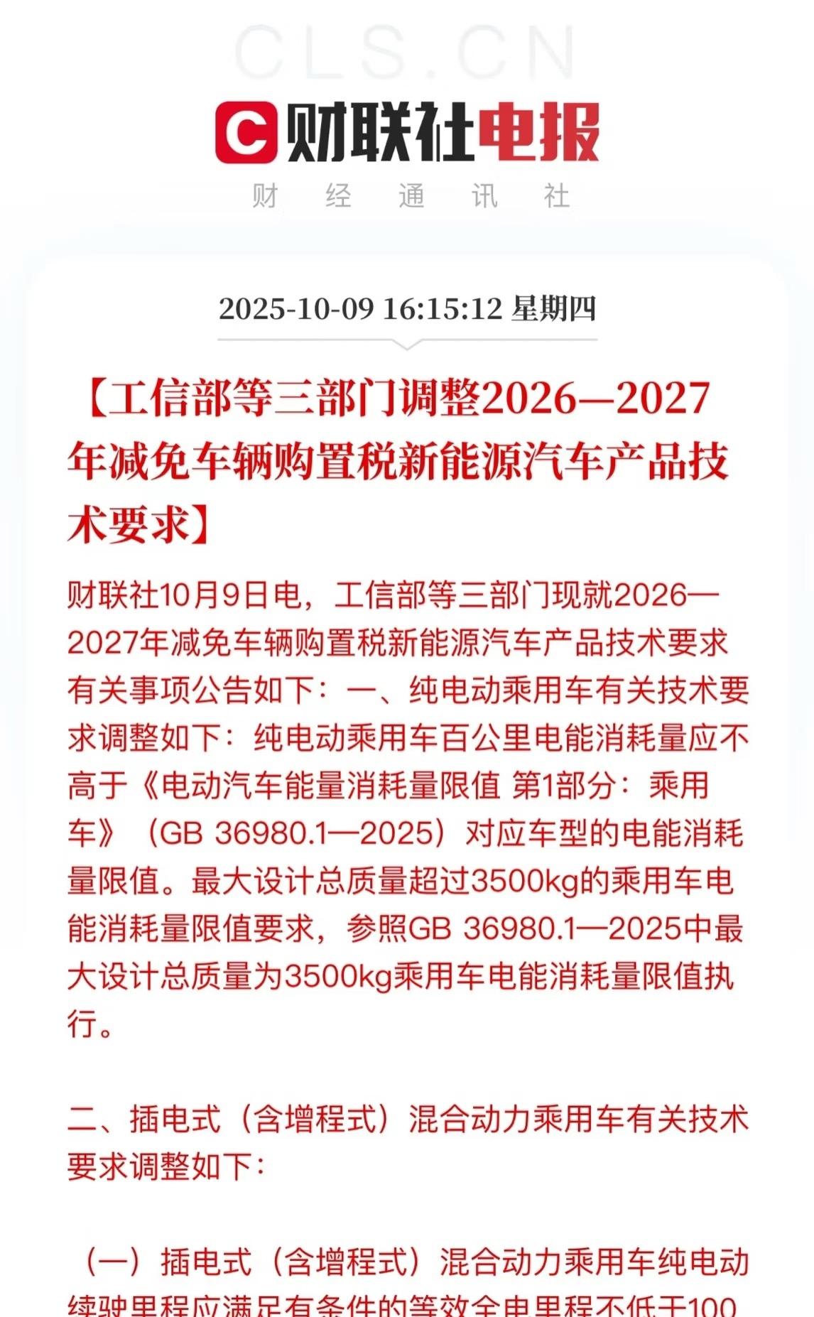 新能源车减免购置税技术要求调整。 总的来说,就是从2026年起大幅提高享受购置税减免的新能源汽车的技术门槛,核心是要求纯电动车更省电,插电混动车的纯电续航必须达到100公里且综合能效更高。此举旨在淘汰技术落后的车型,推动新能源汽车产业向高质量和节能方向升级。这里对纯电100以下的插混影响不大,把电池调整到100就行了,关键是影响标100以下,但是又不产的插混车,影响低配车型最低售价。