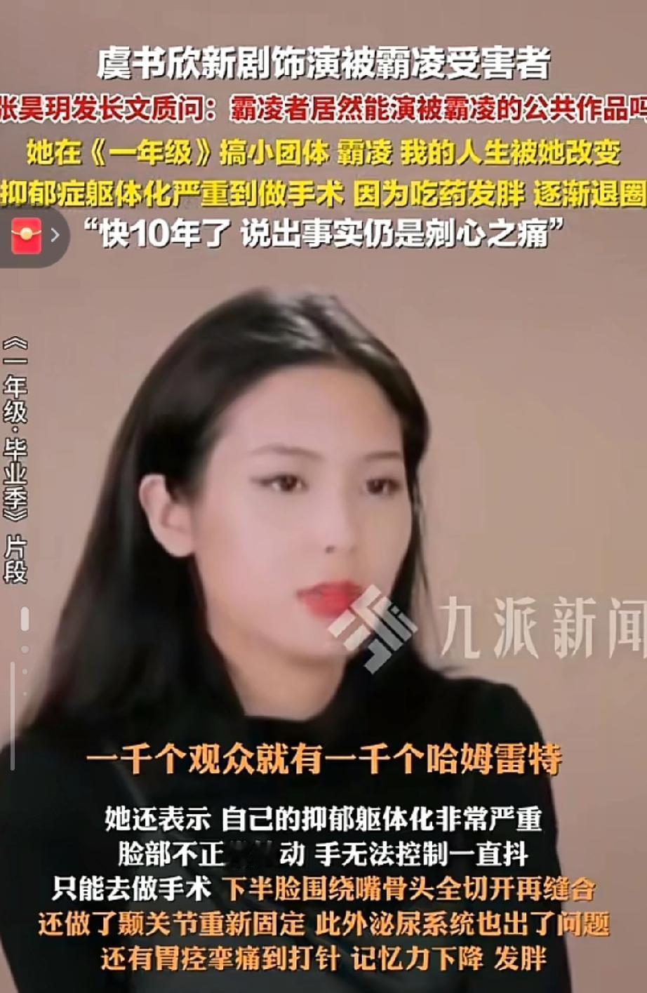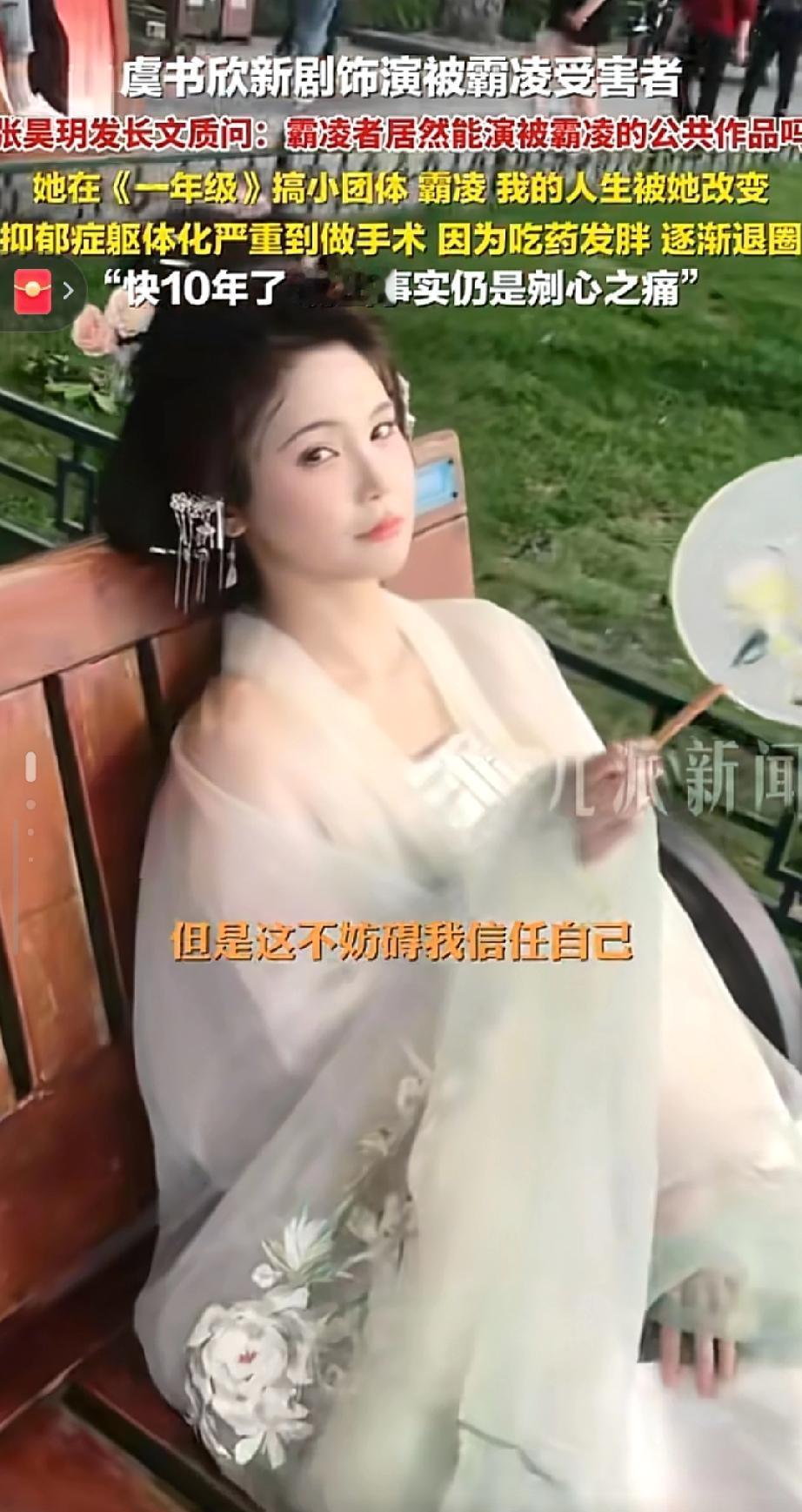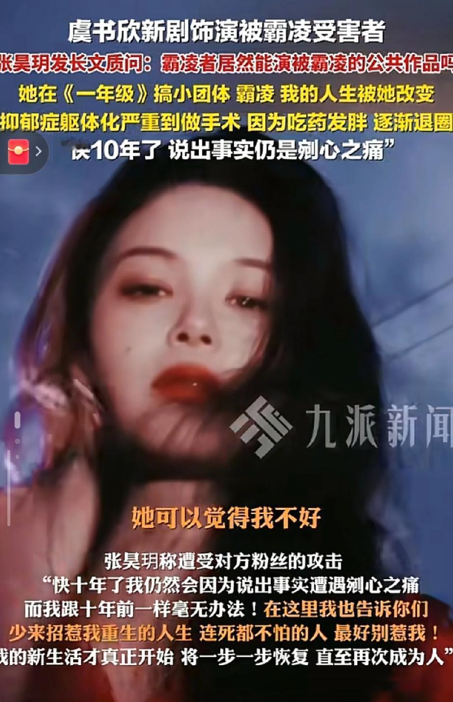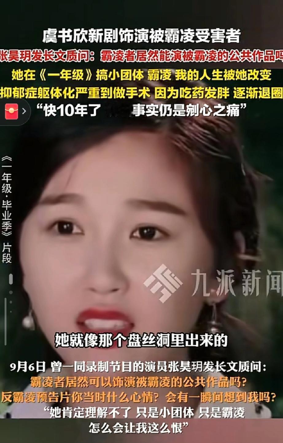 演完霸凌者又来演受害者?虞书欣新剧这波操作把人看懵了。她即将上线的新剧《失重》,饰演一名校园霸凌的受害者,本是正能量题材,却意外牵出一段旧事。 一位名叫张昊玥的女生突然发文,自称是虞书欣中学同学,实名指控其在校期间带头孤立、嘲讽自己,甚至给自己起外号“蜘蛛精”,导致她长期抑郁,心理留下阴影。如今虞书欣却要演“被欺凌的女孩”,她质问:“你有没有资格演这个角色?当年的我,又该由谁来演?” 此事迅速发酵。网友观点两极:有人力挺张昊玥,认为受害者不该被遗忘,艺术不能脱离现实;也有人质疑时间久远、证据不足,反对将角色与演员私德强行绑定。 但不可否认,这起事件揭开了一道被忽视的伤疤——公众人物的过往是否该被审视?演“受害者”是否需要某种“资格”?更重要的是,那些曾被校园霸凌的人,他们的声音是否也曾被听见? 演戏可以重来,但青春只有一次。希望《失重》能真正关注霸凌之痛,而不是成为争议的注脚。虞美欣 虞书欣霸凌风波 虞书欣霸凌张昊玥