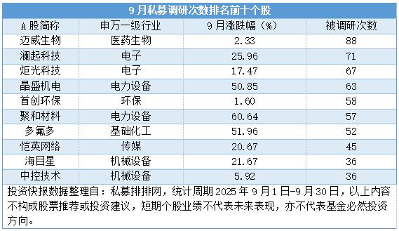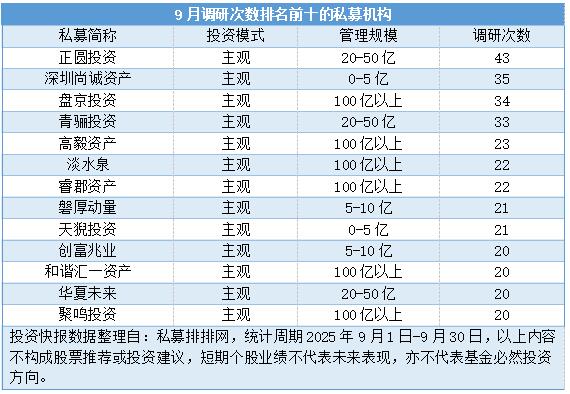 9月共有65只个股受到私募机构调研高度关注,被调研次数均不少于10次,其中更有20只个股被私募机构高频调研不下20次。