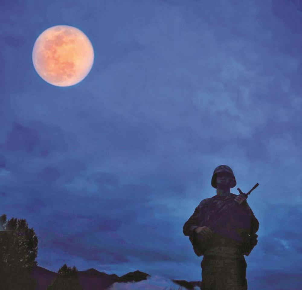 他头顶军徽,手握钢枪,与明月遥遥相对,如雕塑般地挺立着,眼观六路,耳听八方,时时警惕着周边的动静。从他身后望去,俨然是一幅唯美的天然艺术剪影。“哨位就是战场”,在这花好月圆之夜,他孑然一身,为熟睡的战友们守护着安宁。“秦时明月汉时关,万里长征人未还。但使龙城飞将在,不教胡马度阴山。”像他这样头顶边关月的“飞将”,又何止一个?