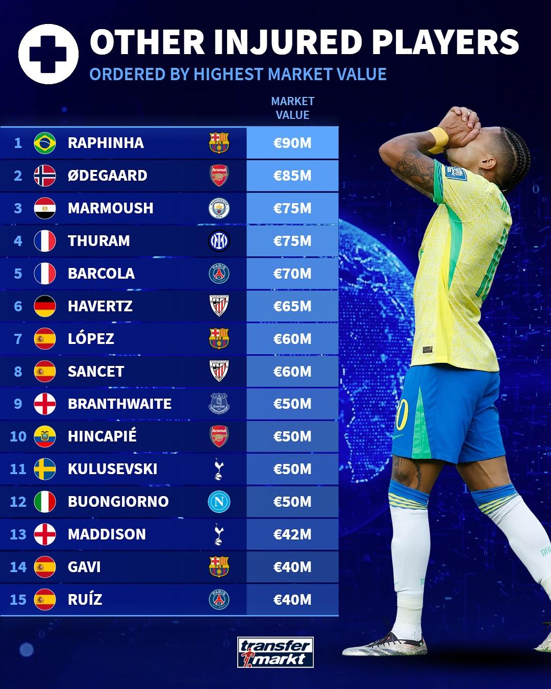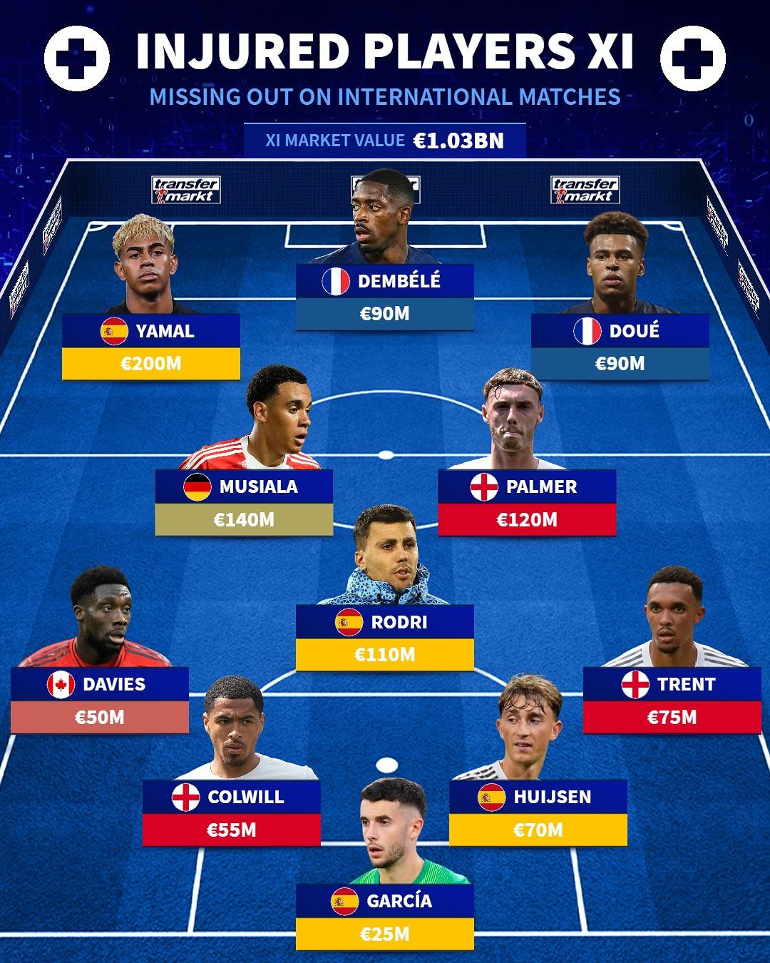 虎扑10月10日讯德转统计国际比赛日伤病最佳阵容:登贝莱、亚马尔领衔,罗德里、帕尔默在列。