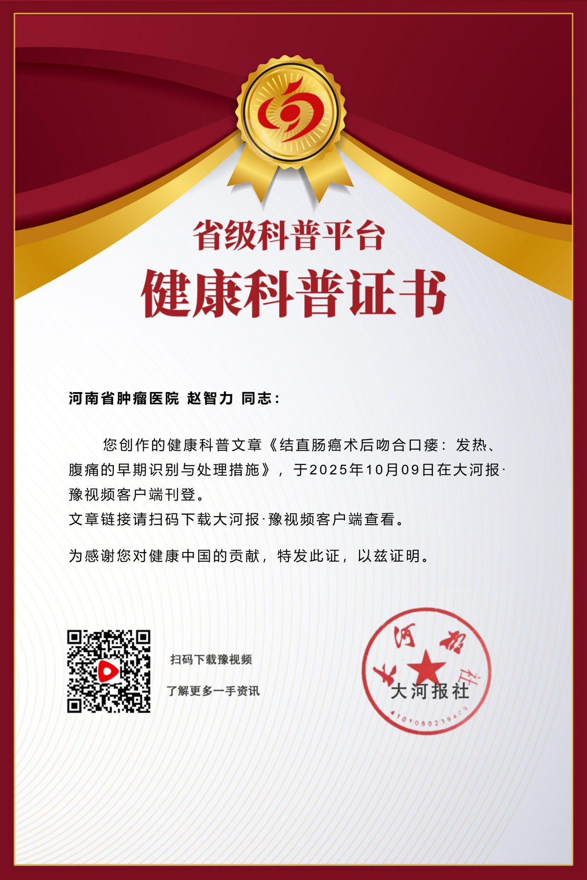 结直肠癌术后吻合口瘘虽然是一种严重的并发症,但通过对发热、腹痛等早期症状的识别,及时采取合理的处理措施,大部分患者能够得到有效的治疗。同时,做好术前、术中及术后的预防工作,可以降低吻合口瘘的发生率。患者和家属也应了解相关知识,积极配合治疗和护理,共同促进患者的康复。希望通过以上科普内容,能让大家对结直肠癌术后吻合口瘘的早期识别与处理有更清晰的认识,为患者的健康保驾护航。(河南省肿瘤医院赵智力)
