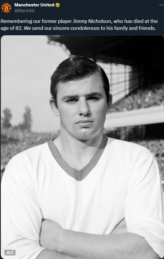 曼联官推写道:“缅怀我们的前球员吉米-尼科尔森,享年82岁,向他的家人和朋友致以最深切的慰问。”