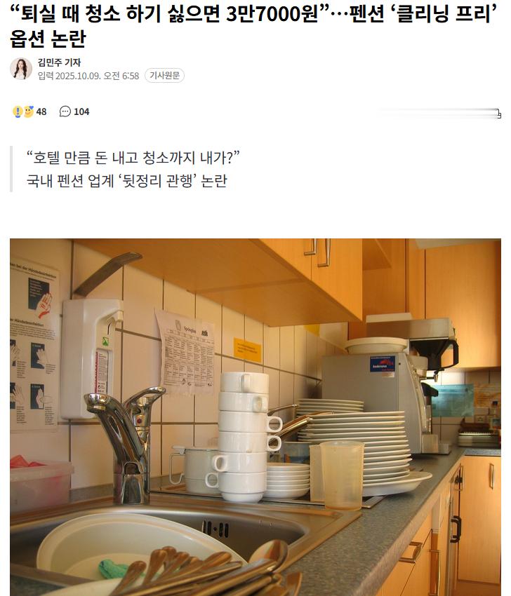 韩国度假屋收取堪比酒店的住宿费,却将清扫劳动转嫁给客人,这种"退房打扫惯例"引发的不满日益高涨。在此背景下,出现了所谓"cleaning free(免打扫)"选项,即若退房时不想打扫房间则需支付额外费用,这引发了争议。