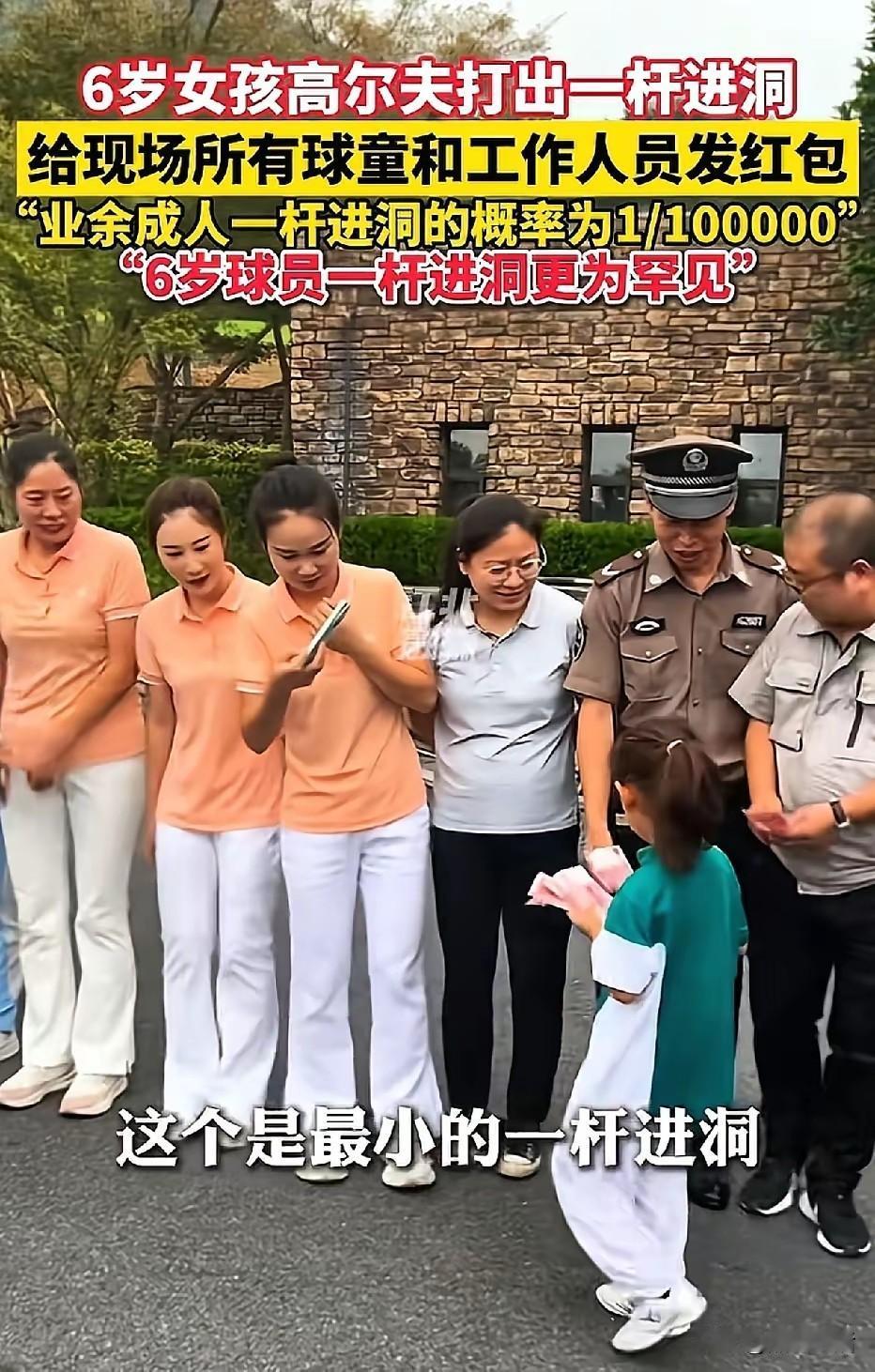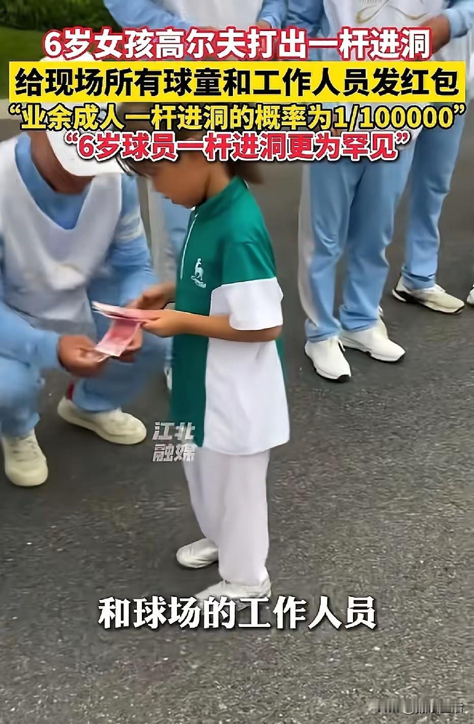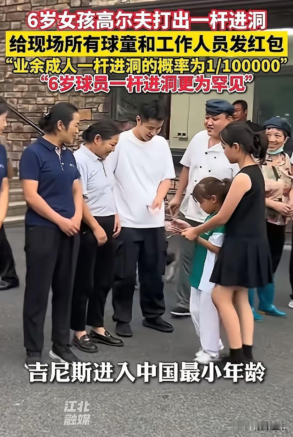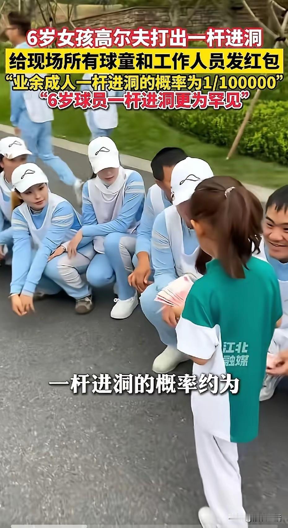 高尔夫规矩,一杆进洞者要给,门童发红包,这个6岁小女孩,就当场,给上百名哥哥姐姐们,发万元红包,大家都蹲着,一个个等着百元“奖励”, 能看出,球童和工作人员,满眼的羡慕,大家都对这个比自己小,十几岁的小姑娘,取得这么好的成绩,表示祝福! 6岁女孩王润雨,这一杆可是有水平,据说几率是十万分之一, 真为她高兴! 据说前一个纪录保持者,比她大两岁, 教练还说,除了运气,更多的是她刻苦的训练, 看来没有少泡“训练场”啊!在别人踢足球的时候,小小的她已经挥杆数千次了! 小小年纪,虽然还是娃娃脸,但那坚定的眼神,着实让人敬佩! 妈妈陪着她给大家发钱,她认真的给大家数出来,一一递给大家,满脸的兴奋!