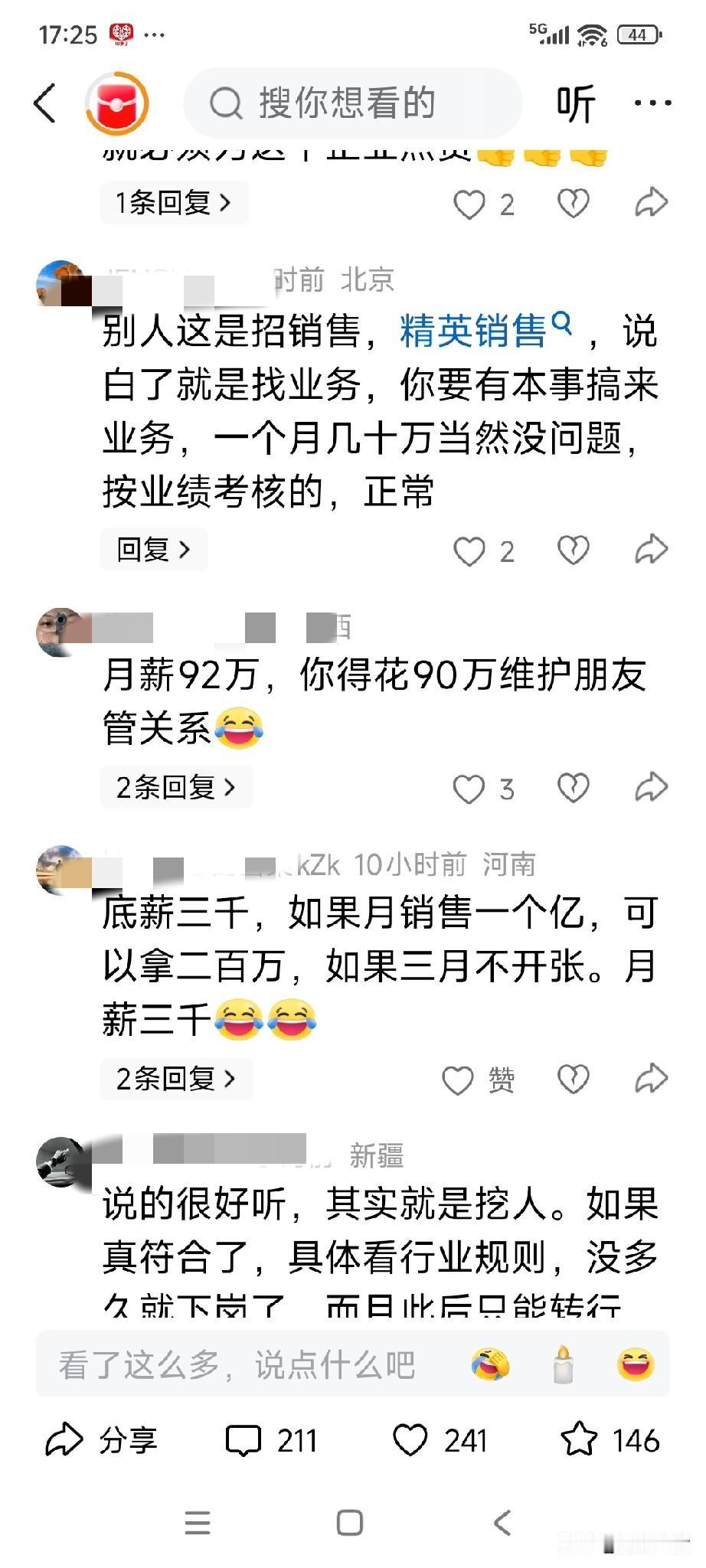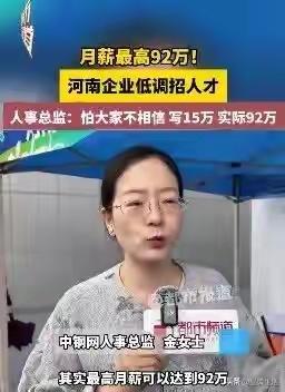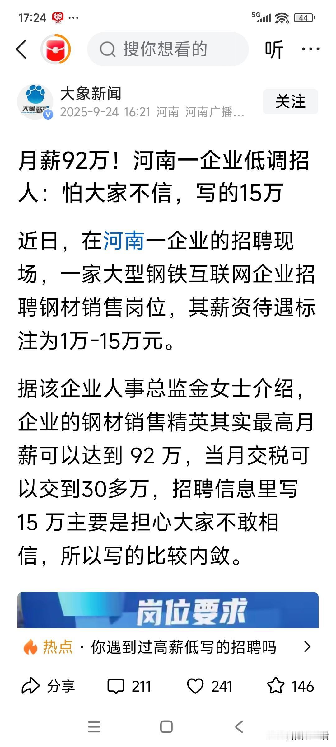 河南除了胖东来,还有月薪92万的销售岗?某钢铁企业招聘销售,1-15万,月薪,怕大家不相信,人事部说,实际岗位工资可以到92万?需要招10个人? 太夸张了吧? 有人说,销售工作底薪不高,也可能3000保底,主要靠销量,月薪90万,你得销售1个亿的单子吧?凭本事吃饭,无可厚非! 还有说,这招的可不是底层销售,肯定是来“挖人”的,都是“精/英了”你手里得有稳定客户源,能开出“大单”才行! 不过如果带着老客户跳槽,也面临几年后下岗只能转行了,业界口碑差了! 河南果然厉害,早就知道胖东来月薪高,保洁员都是上万收入了, 这个钢铁厂,估计也是行业老大哥了,能开出90万的月薪,交/税每月得30万, 这个肯定是“销售精/英了”,没有几年,甚至更长时间的摸爬滚打,出不来的!