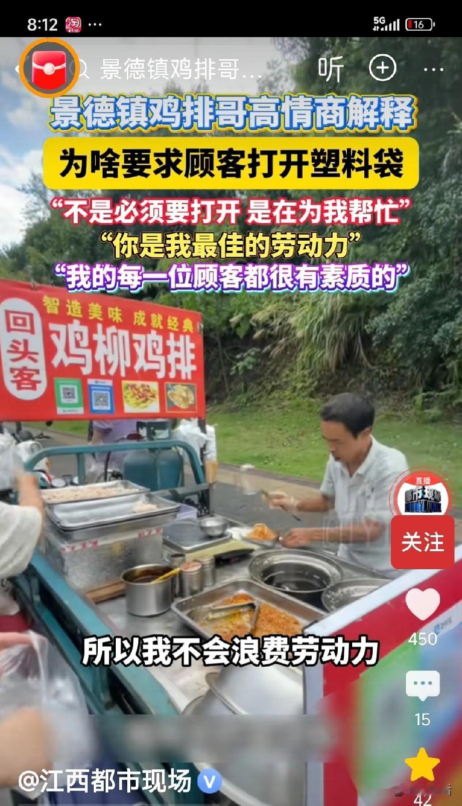 6元鸡排哥,66元情绪价值!难怪他爆火!每天12点前,一定要赶往小学,完成和小孩子“5元一个鸡排”的约定! 鸡排哥,因为带着手套,不方便打开塑料袋,每次炸好,他都让“美/女,帅哥”帮忙撑开塑料袋,还美其名曰,塑料袋飞了,我可不给鸡排哦? 接受采访时他说,我的顾客都是很有素质的,不是一定要他们打开,是她(他)们在帮助我,我很感激他们的!情绪价值拉满! 忙不过来,鸡排嫂也来帮忙时,他说:要非常感谢我的老婆,她功劳最大!把鸡排嫂说的开心坏了,看看鸡排嫂戴的金/项/链,看看那满足的笑,情绪感满满! 也许你说他的6元鸡排,没什么特别,但就是普通的鸡排,他都给小学生们让利1元,每天都在那里守候!5元一个,孩子们开心,鸡排哥也开心! 愿善良的人,生意火火!