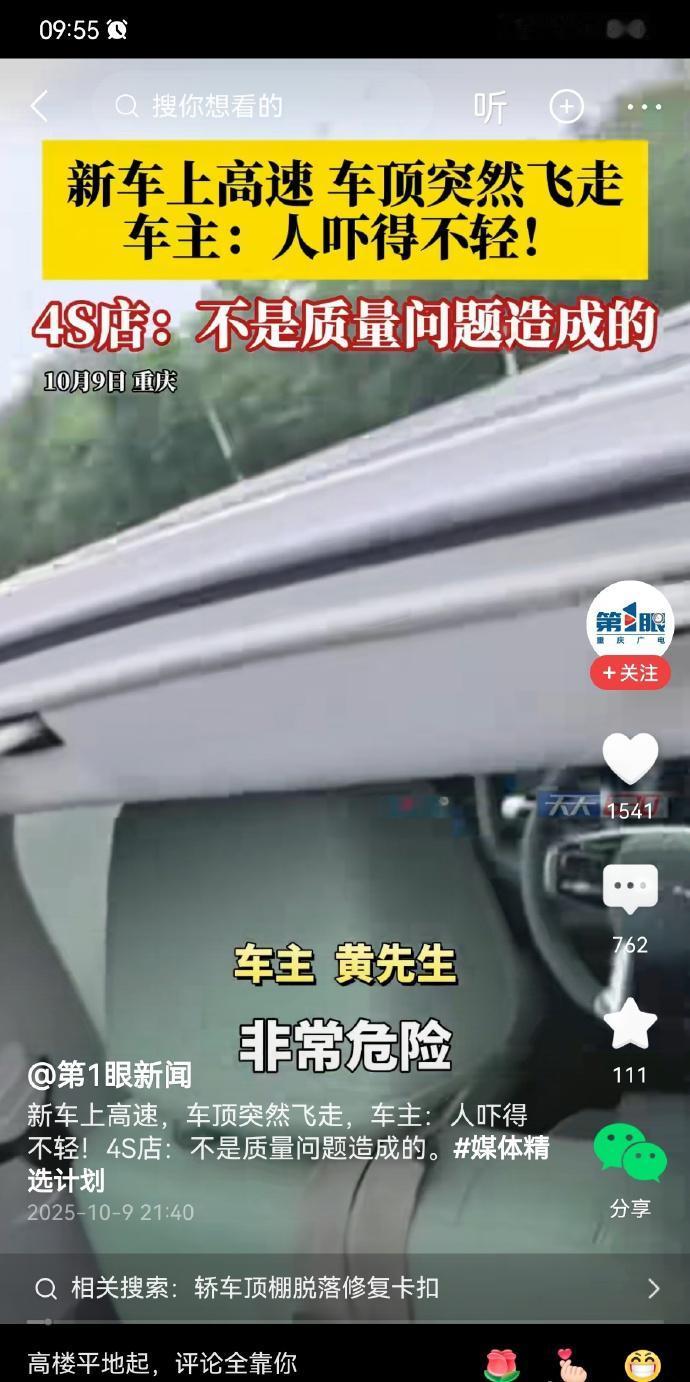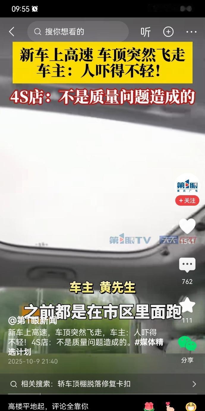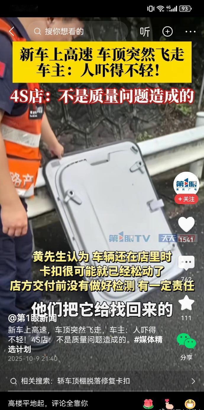 【新车上高速,车顶飞了?】 新车上高速,车顶飞了?这种可拆卸的车顶常见于硬派越野车,是很成熟的技术,不是什么高科技。 车主认为是4S店的问题,在交车的时候没有检查顶棚是否已经关闭。 而4S店则认为是车主的问题,车已经交付出去了,自己不检查车况就上高速怨谁呢! 大家觉得这件事,厂家和4S店有责任吗?【来自懂车帝车友圈】