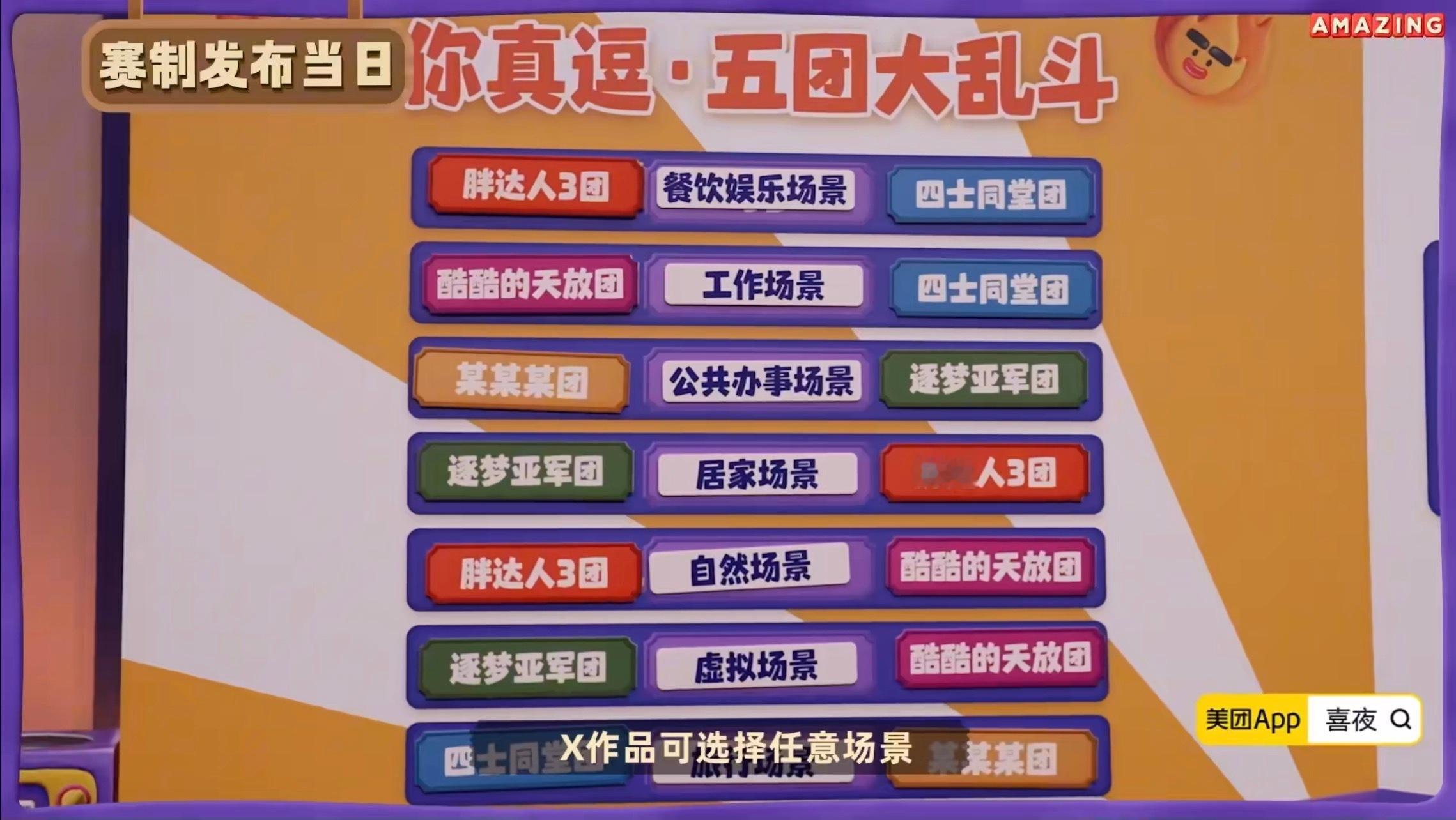 喜人奇妙夜《喜人奇妙夜2》发布第二赛段赛制及分组,第二赛段五大喜团各出3个作品,其中14个作品两两pk,获胜作品积3分。OK!BOOM抽中余下的一个X作品,将于全程最高分作品pk,如果分数全场最高分则积6分。场景赛对战分组如下: