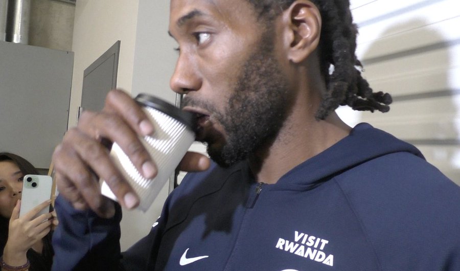 赛后,伦纳德边喝东西边接受采访,记者问他杯子里是什么。