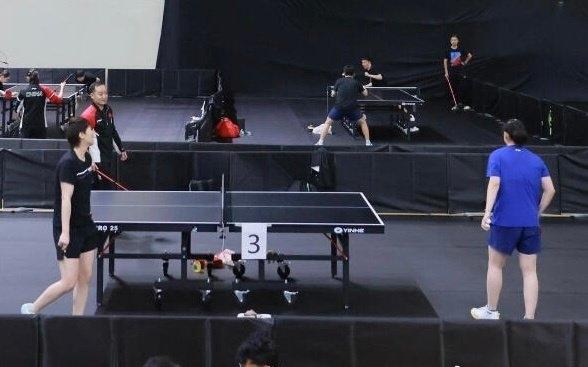 终于看到国乒的孩子们了[笑哭], 个个这么开心是吃到好吃的东西了吗?[笑哭] 这是昨晚国乒部分球员适应场地的照片,莎莎由邱贻可教练指导着训练,喜笑颜开的莎莎不知道是和谁这么开心。 黑色头发的曼昱正在和徐奕一起训练,旁边站着任浩指导! 蒯曼和大迪在训练间隙一起喝水,看起来喝的是瓶装水,这还可以。 训练场地的每个球台周围都有黑色的围挡,就像我们平时打球的场地一样。 明天就要开始小组赛了,也不知道何时发布分组情况,一起期待吧[笑哭]。
