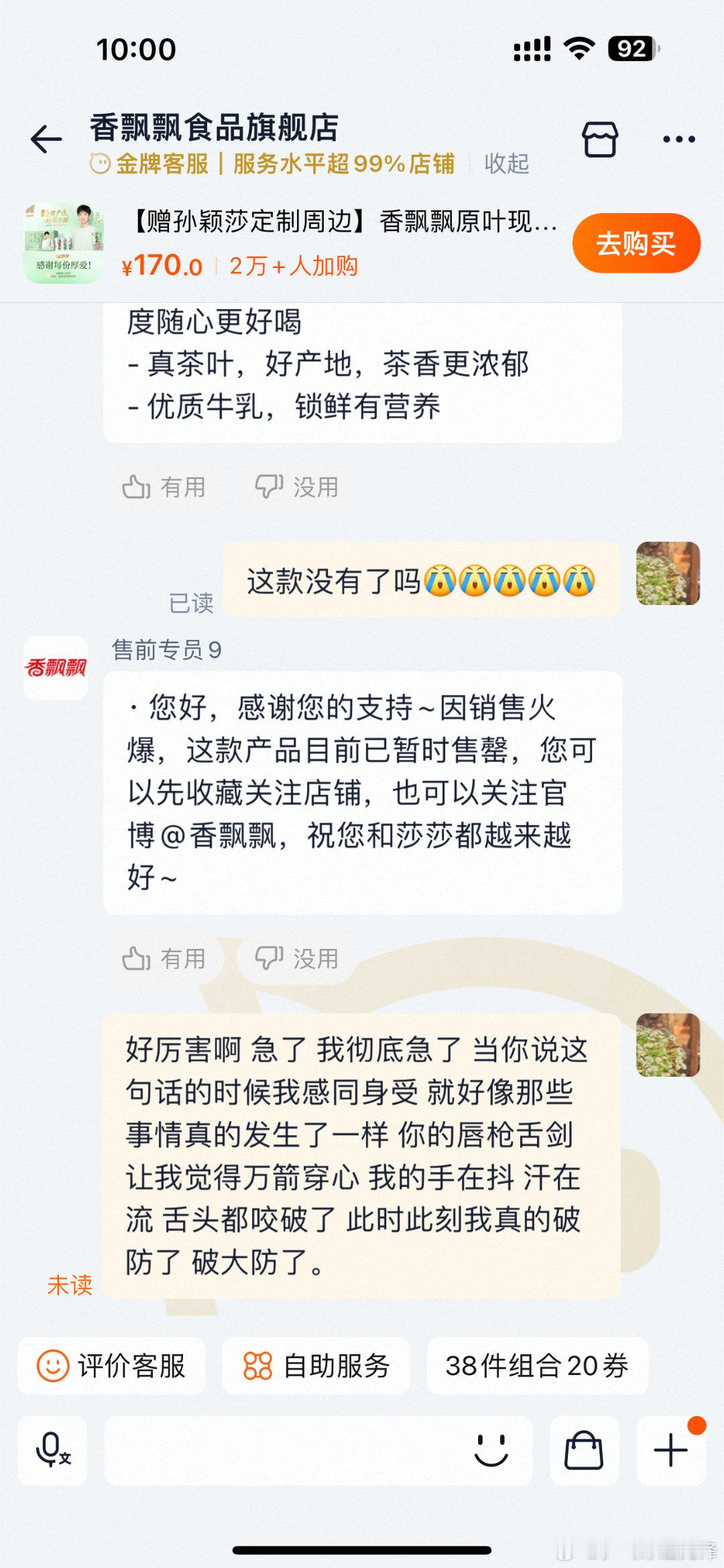 孙颖莎香飘飘同款秒售罄这抢购速度,官宣即售罄,这火爆场面,充分展现了莎莎强大的冠军号召力,也看到了大家对她和香飘飘这次合作满满的喜爱与认可!🔥 没抢到的小伙伴,让我看看有多少人和我一样在等补货!