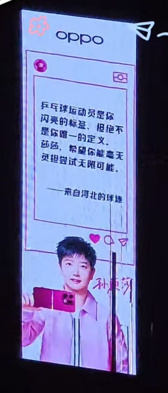 深圳的朋友们有没有偶遇莎莎的大屏?OPPO这次给莎莎安排了飞天屏,在OPPO总部春笋大楼的上空能看到莎莎的飞天屏,可以说是相当的权威了,而且OPPO内部为了庆祝莎莎官宣,还准备了莎莎“大红大紫”痛桌供员工打卡,请问我能申请成为OPPO的员工吗?不为别的,就是想为OPPO打工~孙颖莎OPPO全球合作伙伴 孙颖莎同款findx9 孙颖莎同款OPPO平板