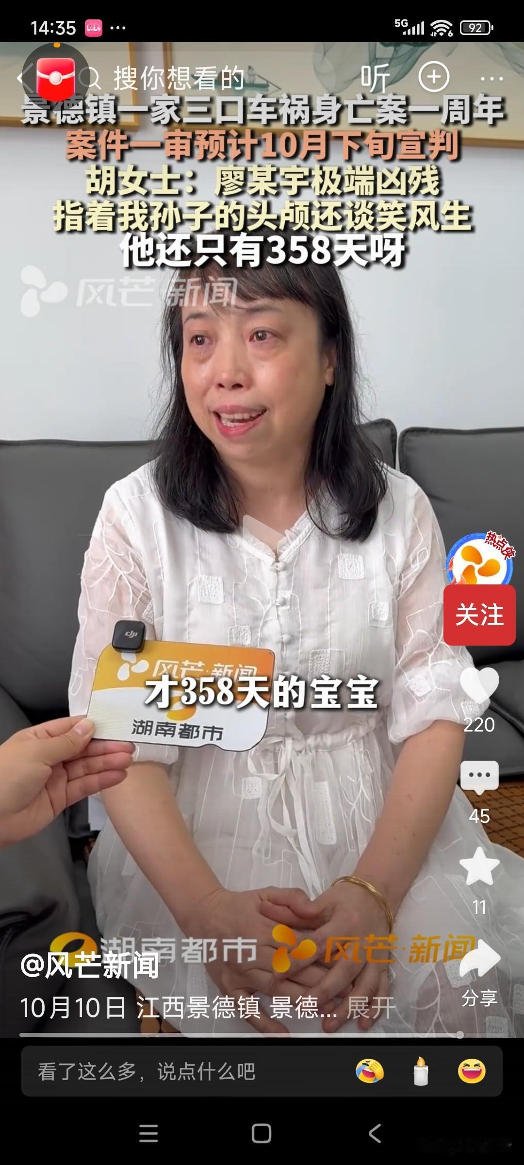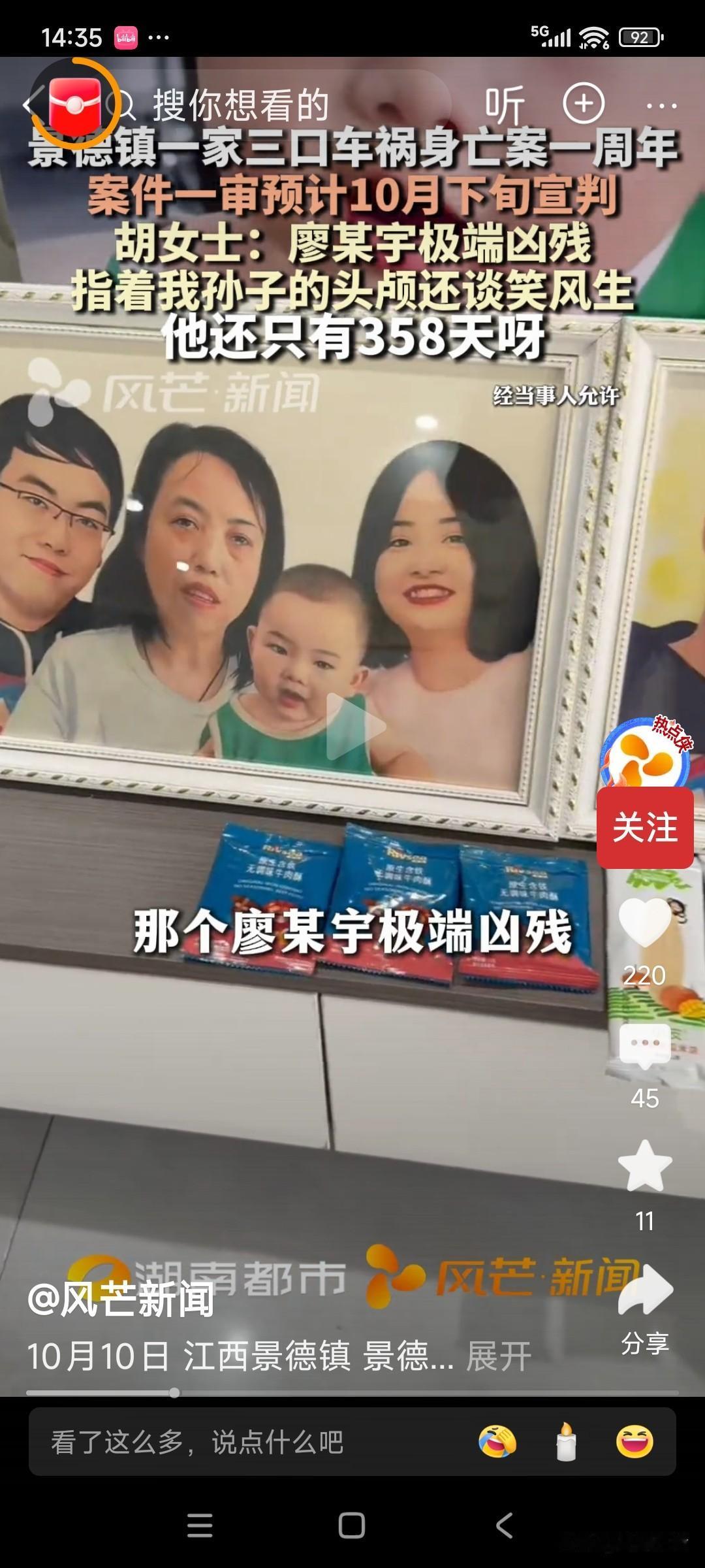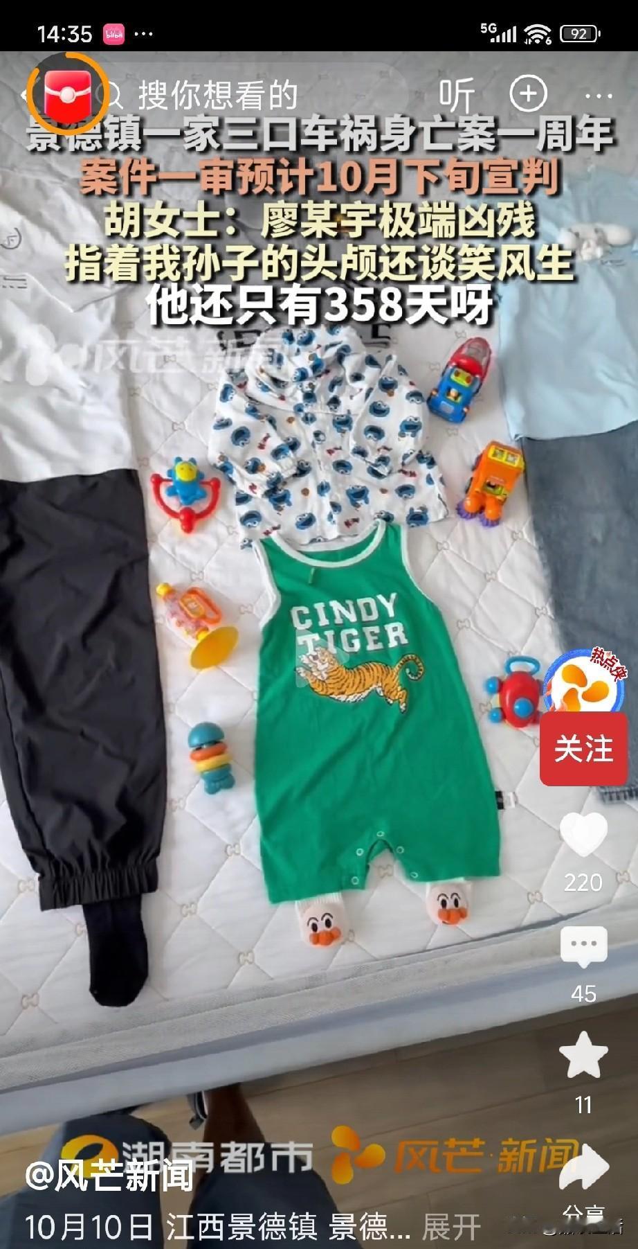 只活了358天的小孙子,照片贴满墙!一家三口的衣服整整齐齐,摆在床上!80万,怎么能弥补?景德镇廖某,在限速40的闹市区,飙到129迈,撞倒了一家三口啊,都没了! 出事后,20岁廖某,把自己的女友从副驾接下来,只是看了自己的车,点燃了一支烟, 根本没有去管受伤的人,还指着宝宝的头,打电话,谈笑风生, 这,哪个奶奶受得了? 廖某的父亲,更是说:当初出事是“天/灾”,没办法, 你们要告我们孩子,就是“人/祸”, 并拿出80万,想私了, 胡女士说,儿子,媳妇,两边都是独生子女,孙子也是单传,怎么可能要钱?又怎么可能让撞死自己儿子的“人”,来给自己养老? 她们不接受所谓的“道歉”,只要惩处! 10.20日,要公开审理了,希望可以得到圆/满的结果!
