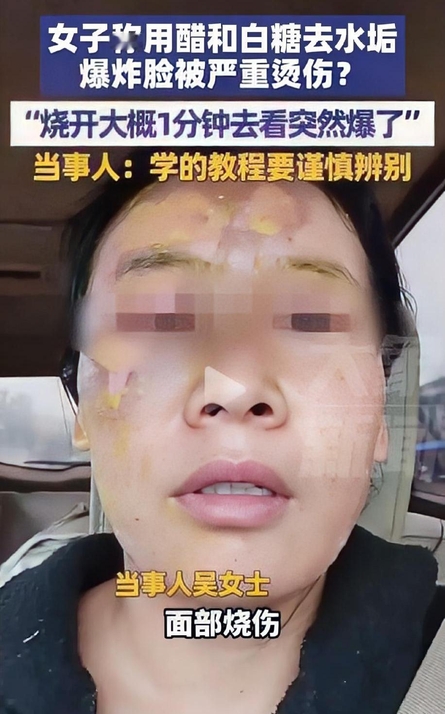 太无知了!河北一女子为除水垢,轻信网上教程,将醋和白糖放入开水壶加热。加热大概一分钟后,好奇开盖查看,突然发生爆燃,导致脸部受伤。 这种操作极其危险!白糖在高温下可能发生焦化反应产生大量气体,密闭容器内压力骤增就会爆炸。但凡了解这点,绝不敢如此尝试。即使你要煮,可以把盖子打开啊,只要不是密封的,大概率都没事。 网络上教程请勿盲目模仿尝试,看看就行了,别当真。