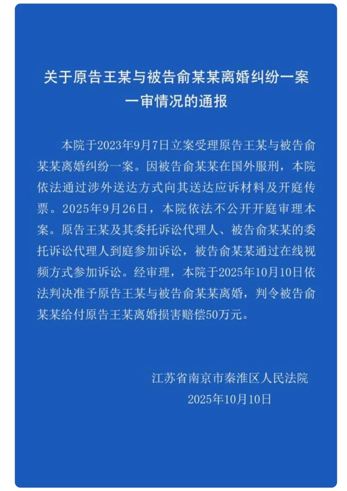 10月10日江苏省南京市秦淮区人民法院一审宣判“泰国坠崖案”当事人王暖暖(化名)与俞某某的离婚纠纷案。法院判决准予双方离婚,并判令被告俞某某给付原告王暖暖离婚损害赔偿50万元。 该案于2025年9月26日不公开开庭审理,因被告俞某某在泰国服刑,其通过在线视频方式参加诉讼。这起案件也被称为“国内首例被告在国外服刑的离婚案”。
