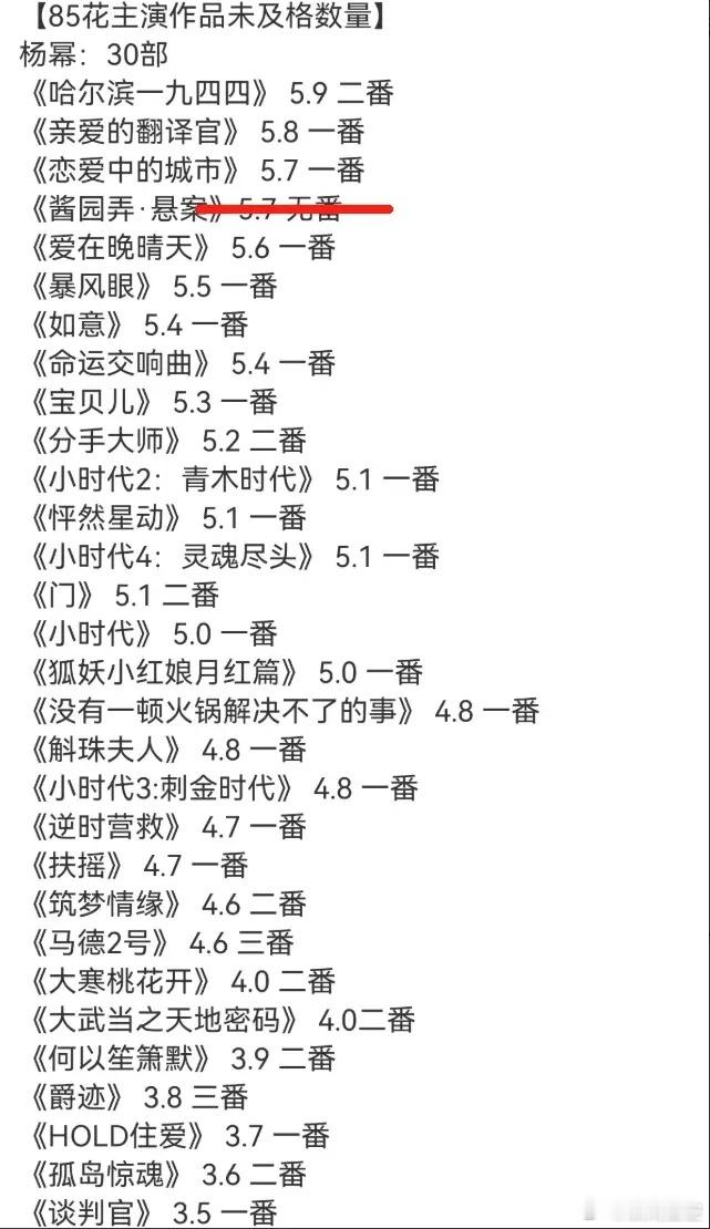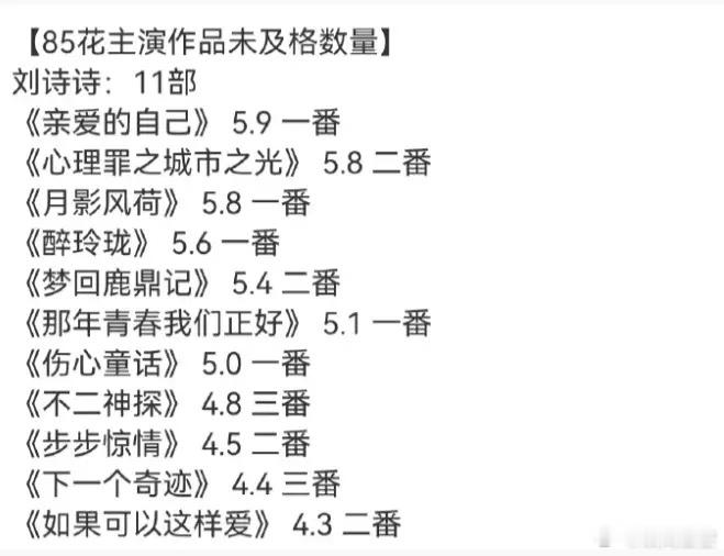 赵丽颖8部,刘诗诗11部,唐嫣15部,杨幂29部,唐嫣之前接的三番外的作品也是最多的,杨幂接戏水平比较一般,接了不少烂剧,刘诗诗但凡接的剧基本都不及格,赵丽颖接戏水平最高。
