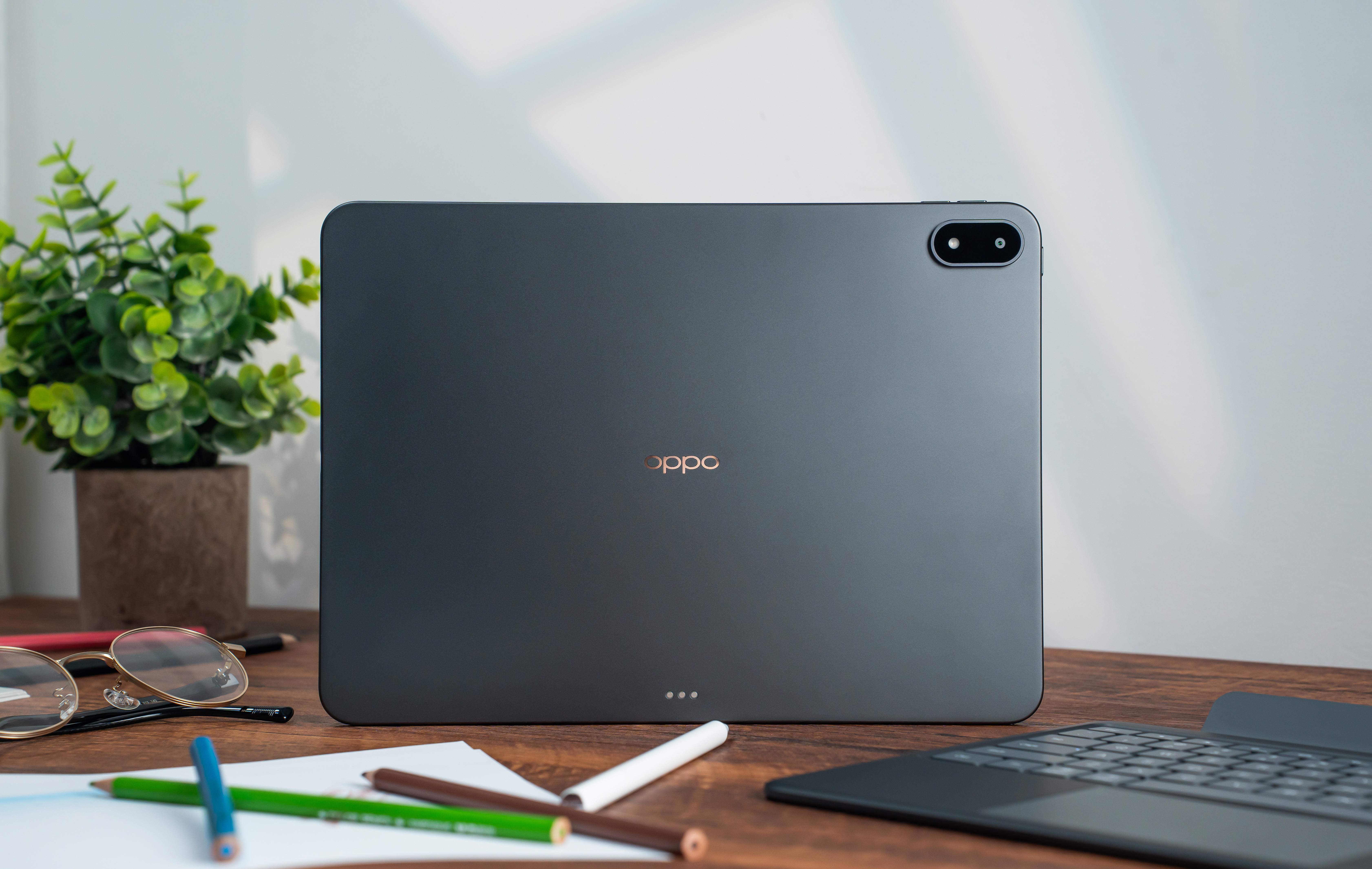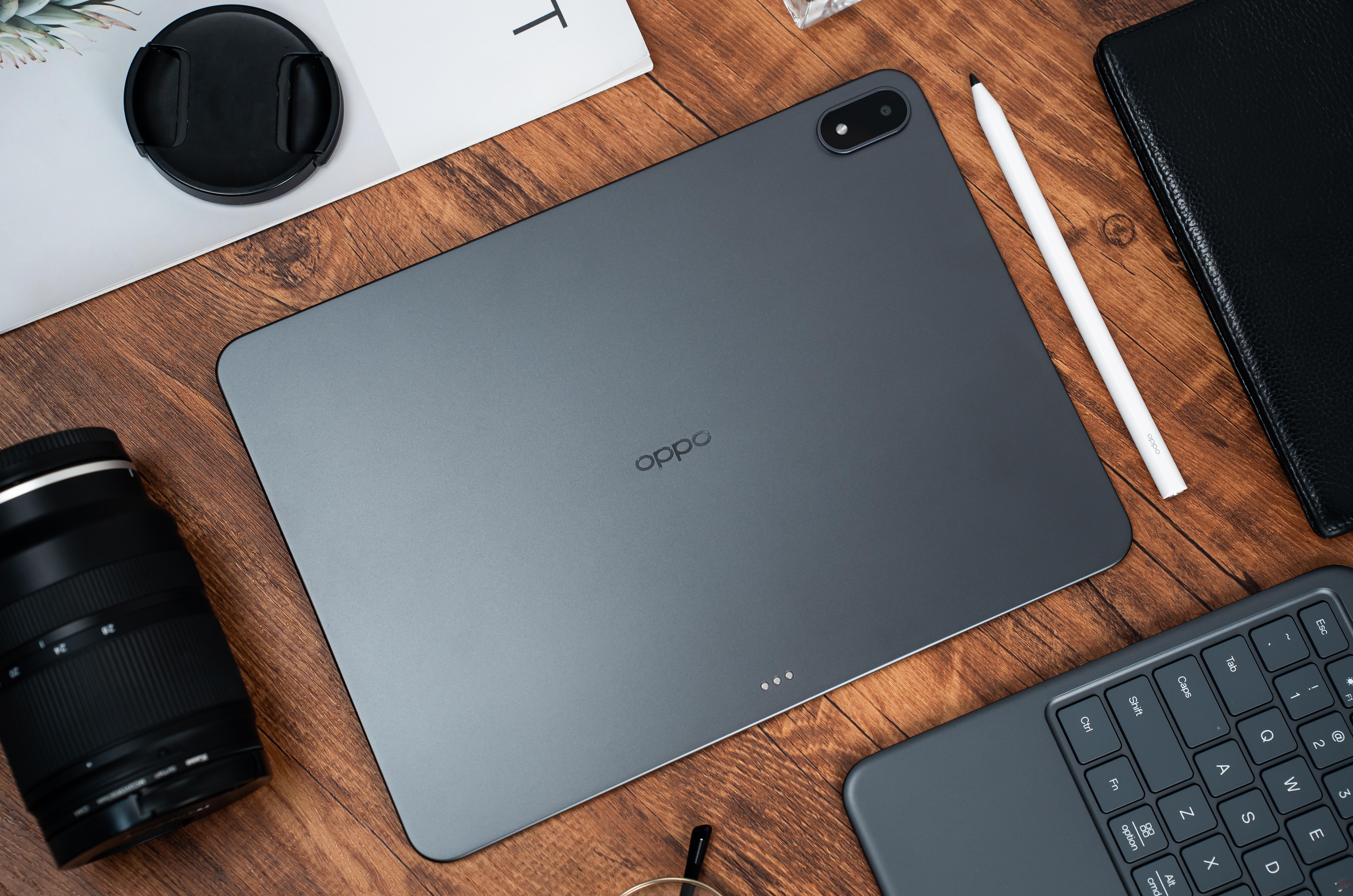 OPPO Pad 5 一出场就自带高级滤镜!背板细腻磨砂质感不沾指纹,和同色系智能触控键盘搭在一起,简直是极简控的梦中情「板」。