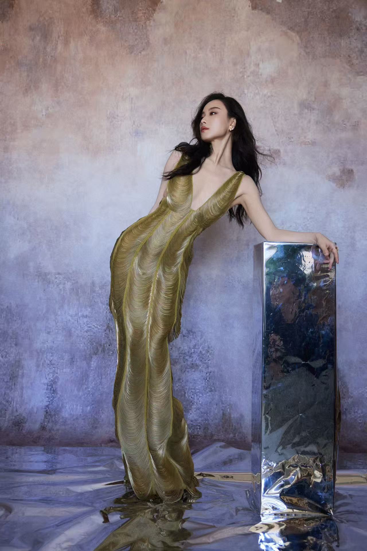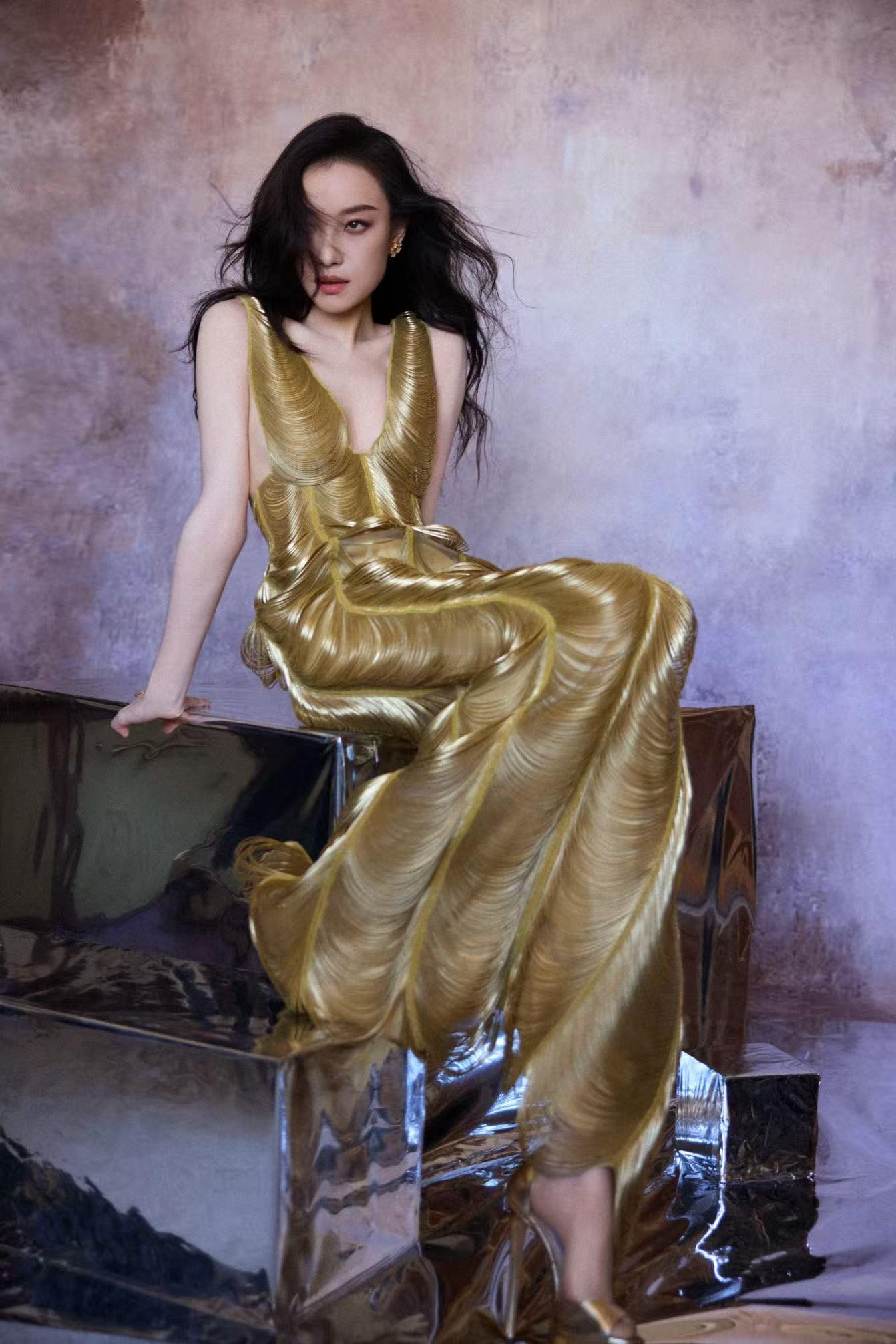 倪妮兰蔻全球代言人 一袭深V鎏金礼服亮相品牌活动,金属丝线随步履流转成光的轨迹,