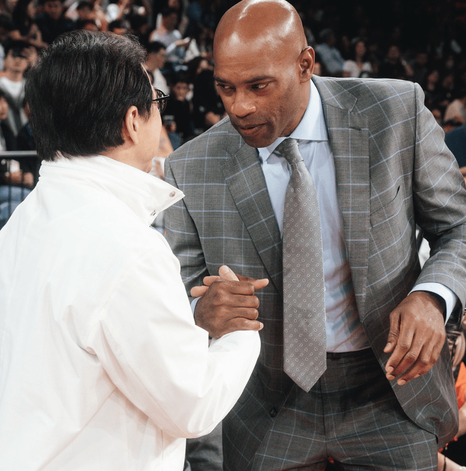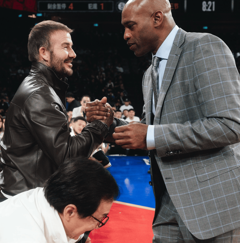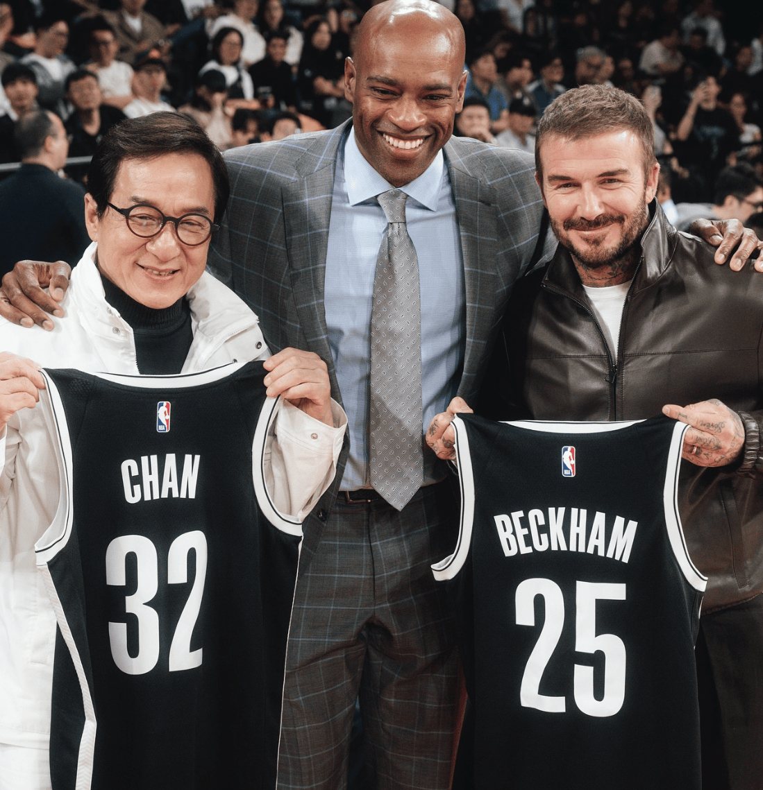成龙&贝克汉姆与卡特合影留念,二人获赠篮网球衣