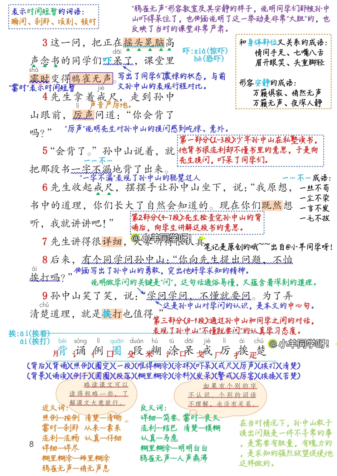 【主题概要】🌻 课文讲述了孙中山小时候在私塾学习时,因为不明白书里说的是什么意思,壮着胆子向先生提问的故事,赞扬了孙中山勤学好问的精神,告诉我们要养成不懂就问的学习习惯。
