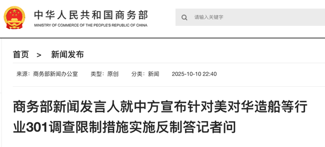 10月10日,商务部新闻发言人就中方宣布针对美对华造船等行业301调查限制措施实施反制答记者问。