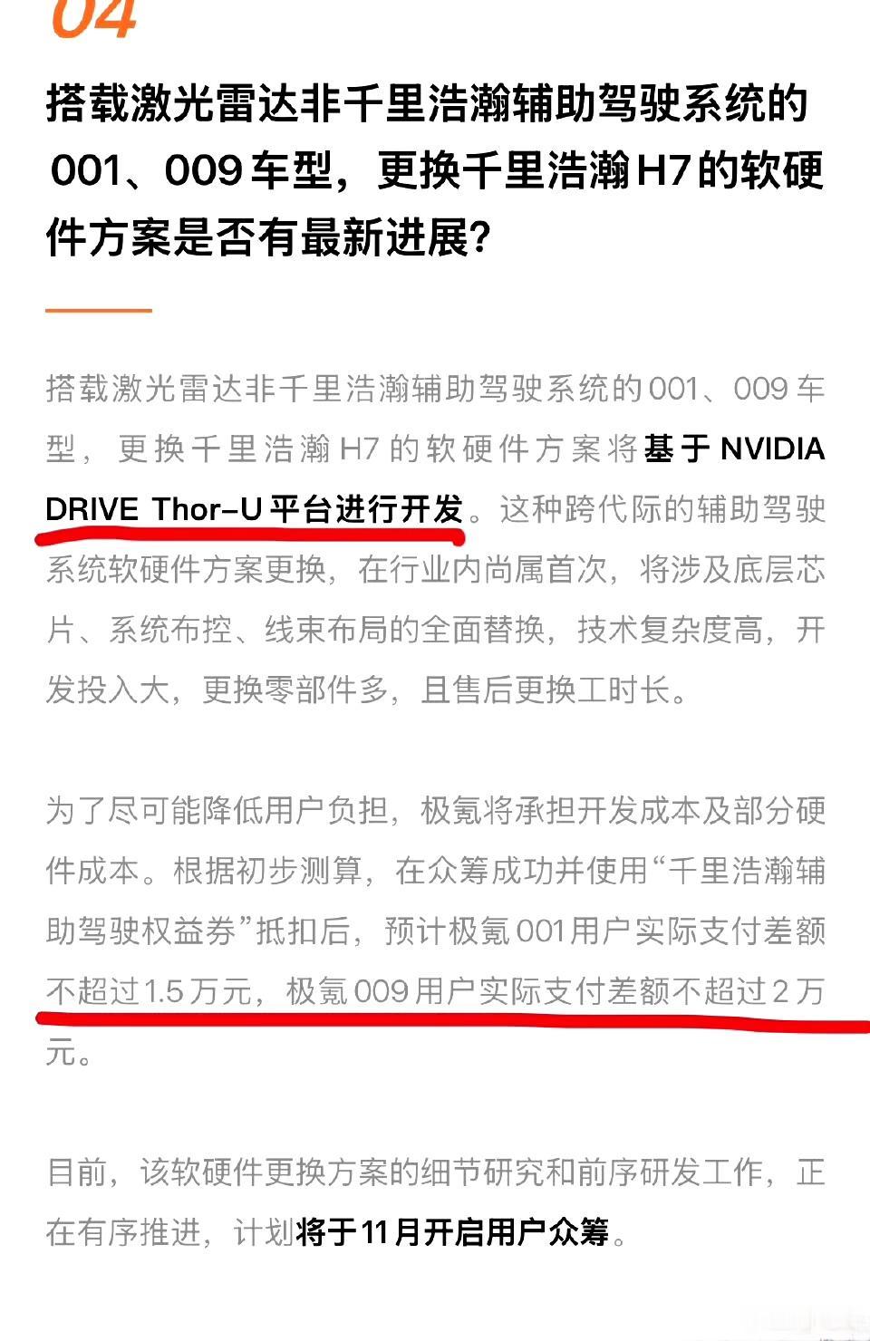 图1: 极氪给大家吃个定心丸了,整个2026年,极氪001都不会有更新。下周要上的就是26款极氪001,到此为止。 图2: 关于那些极氪001基于ME方案的智驾升级。 极氪001车主只需要花不到1.5万,而且是基于英伟达Thor芯片做升级。 这个升级要从Mobleye芯片换成英伟达Thor芯片,对应的线束,电气架构,软件都要适配,工作量确实挺大的。 我的建议是: 极氪001车主如果不是对智驾特别刚需,就别折腾了,工作量太大,你的车得大动。 极氪还是挺良心的。【来自懂车帝车友圈】