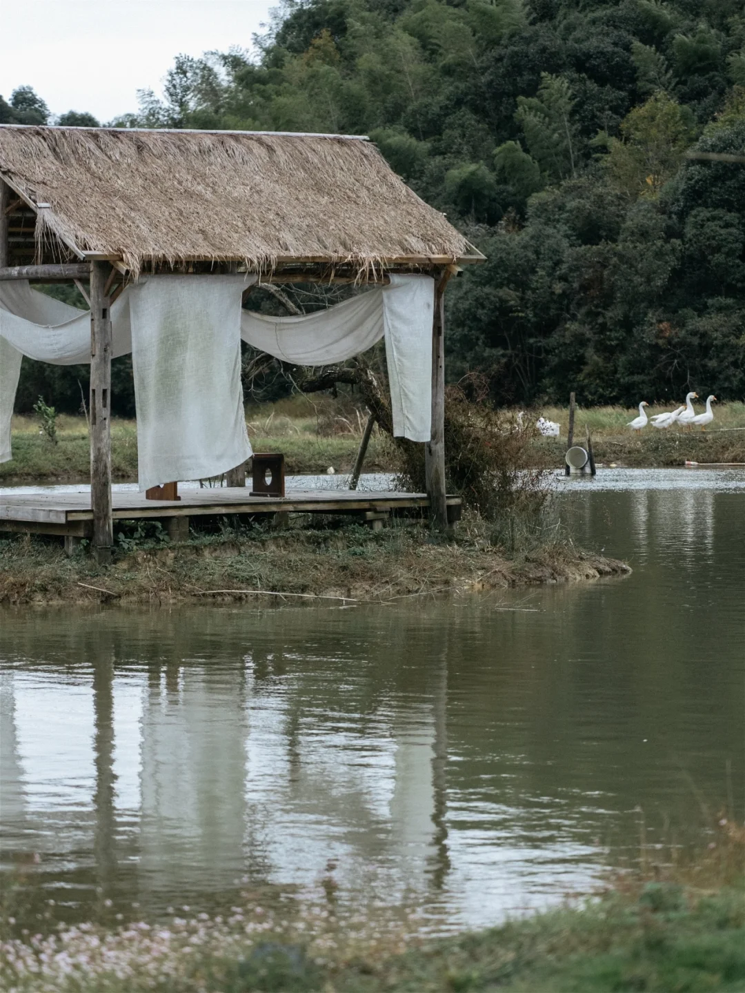 精致的湖中小亭,花园苗圃,都是民宿主所打理,还在花园里养了白鹅,孔雀,真的是把生活过成了田园牧歌的模样。