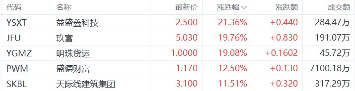 美股异动丨益盛鑫科技涨21.36%,为涨幅最大的中概股