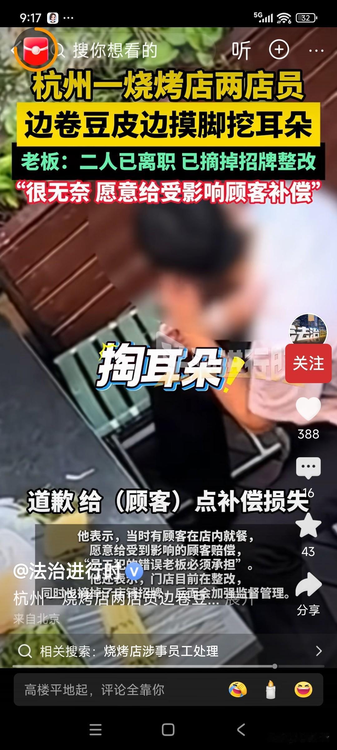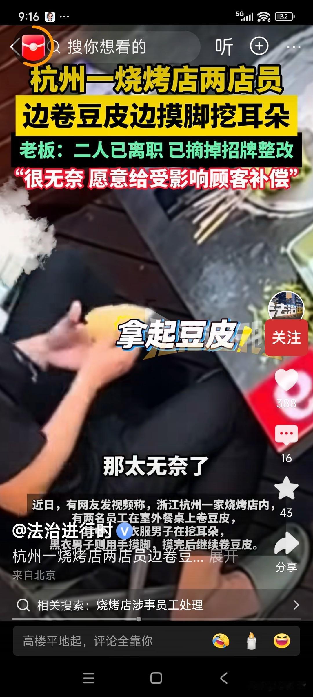 估计不是第一次了?烧烤店,一员工,抓完脚丫,直接上手串豆皮,另一位,掏完耳朵,手都不洗,接着串土豆片,看这丝滑程度,以前也没少这么干吧? 视/频传上去后,烧烤店老/板的电话被打爆了, 他统一回复,已经开除“抓脚丫”“挖耳朵”的员工,也会给当天吃过烤土豆片,豆腐皮,的顾客相应的补偿! 哎呀,看着都闹心,估计当天吃过烧烤的,再也不去第/二/次了吧? 其实这个估计不是第一次了? 主要还是老/板,没有食品卫/生的意识,如果一早就培训员工,让他们意识到,应该干净卫生的操作,戴上一/次/性手套串串,接触菜品,都要保证手干净, 今天事情就不会发生了吧? 以后还有人去吃吗? 还是“眼不见为净”呢?