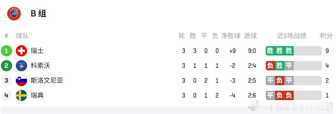 · B组瑞典3场不胜垫底,瑞士三连胜领跑