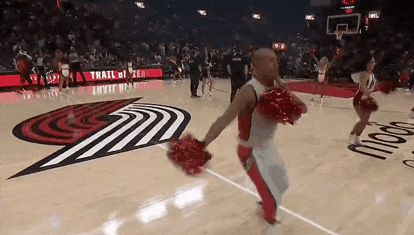 比赛赛前,开拓者主场啦啦队光头男成员激情热舞。