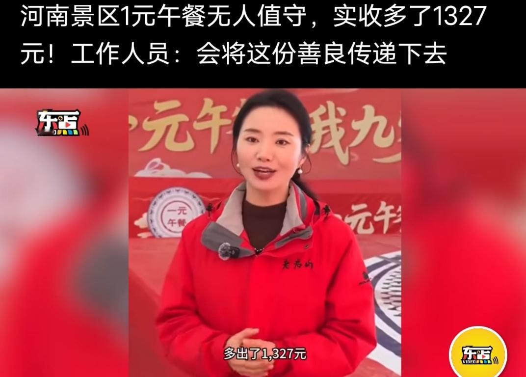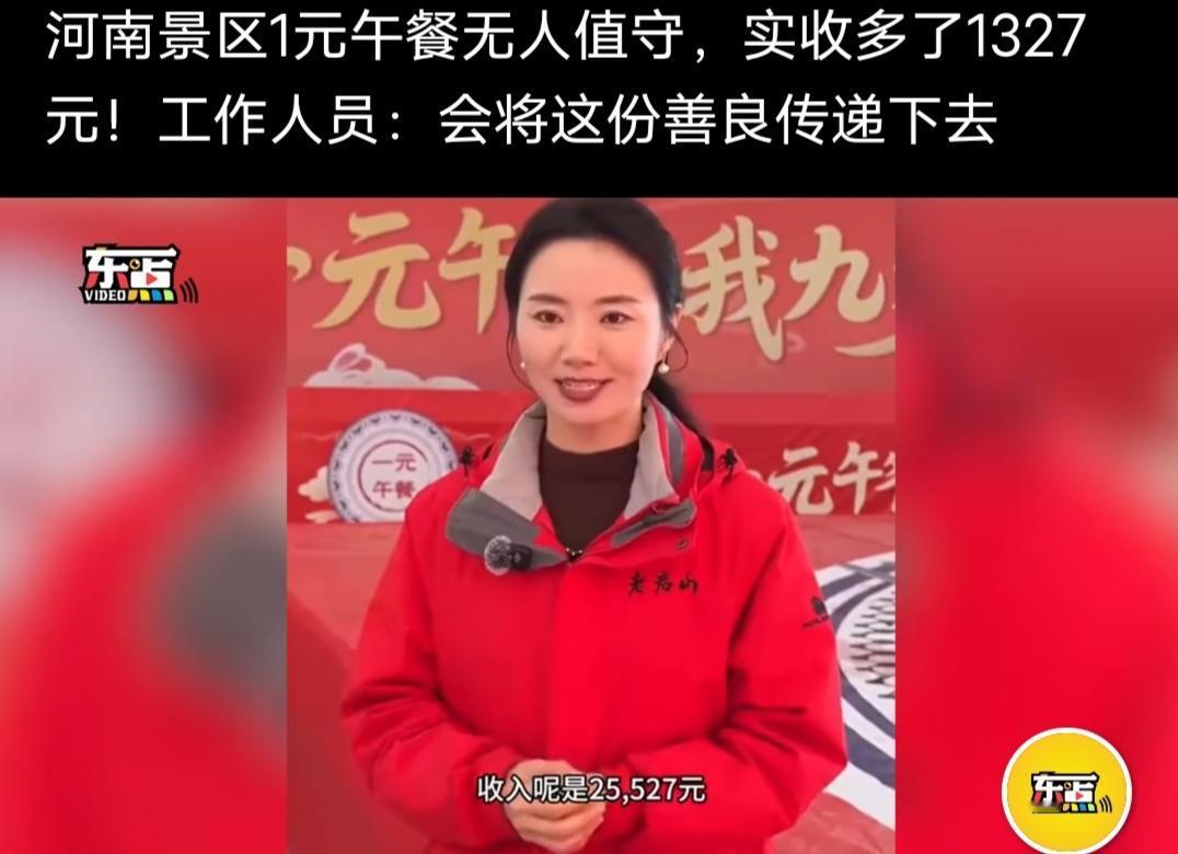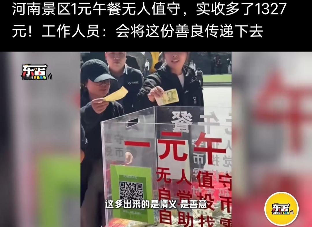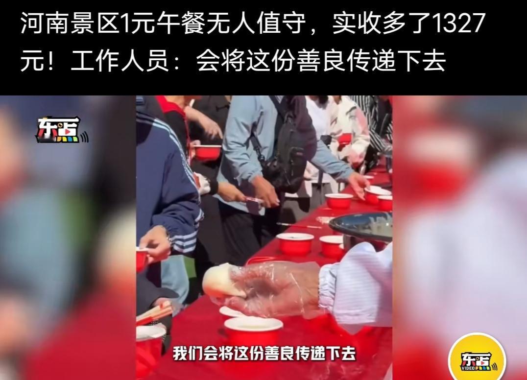 河南景区1元午餐无人值守,实收多了1327元,工作人员说:会将这份善良传递下去! 看到相关媒体平台发布的一条温暖人心的报道,国庆期间,河南老君山景区为游客朋友们提供1元午餐,全自助,没有人值守,整个假期下来,一共卖出24200份午餐,而实际收入是25527元,多收到了1327元,工作人员说,多出来的部分应该是有些游客多投的或者没有找零的,多出来的都是情义,是善意,他们会把这份善良一直传递下去! 真好,这就是双向奔赴的尊重和善意,给温暖有爱的老君山景区点赞,更给自觉诚信的游客朋友们点赞,这样的社会多和谐,愿我们中华儿女越来越美好!