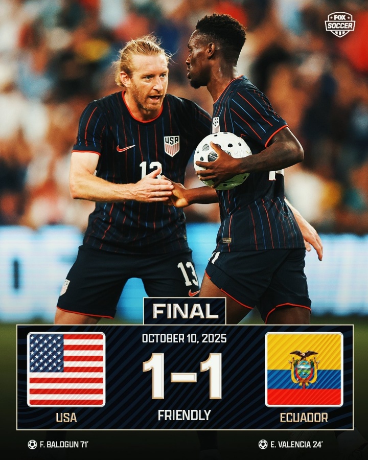 直播吧10月11日讯足球友谊赛,美国1-1战平厄瓜多尔。本场比赛恩纳-瓦伦西亚率先破门,巴洛贡为美国队扳平比分,攻破“南美之墙”的大门。