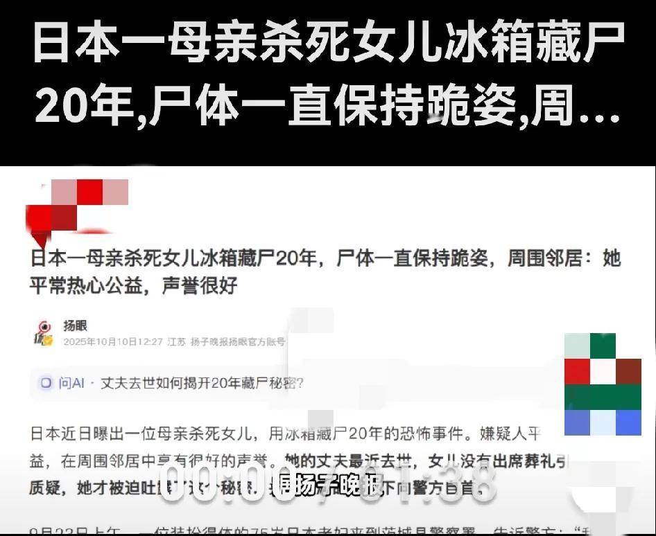 日本狼母虎毒食女,死状惨烈 太残忍了!日本狼妈亲手杀死女儿就够残忍的了,怎么二十年一直让女子死尸成跪姿,这得多大仇恨呐!而且一直藏在自己家里冰箱里,这得多大的胆子啊!多么残酷啊! 据报道日本茨城县一名75岁母亲森惠子杀害女儿并藏尸冰箱20年。2025年9月23日,森惠子在亲属陪同下向警方自首,称家中冰箱藏有女儿遗体。警方在其厨房商用冰箱内发现一具跪姿女尸,覆盖毛毯并放置除臭剂 。 死者为长女万希子(1975年生),约20年前死亡。法医鉴定显示其颈部有勒痕,推测为窒息死亡,头部有钝器击打痕迹 。 再有,邻居说,森惠子长期参与社区志愿活动,常为邻居做饭,口碑良好。但据称她对女儿管教严厉,曾当众打女儿耳光 。 另外,万希子30岁时与伴侣分居,母女关系持续恶化。森惠子丈夫2025年9月去世,女儿未出席葬礼引发质疑,促使她自首 。 遗体保持日式跪姿,上半身前倾。森惠子称因尸臭购买冰箱藏尸,并定期更换除臭剂 。 最后,警方以遗弃遗体罪逮捕森惠子,正通过司法解剖确认死因,动机待进一步调查 。