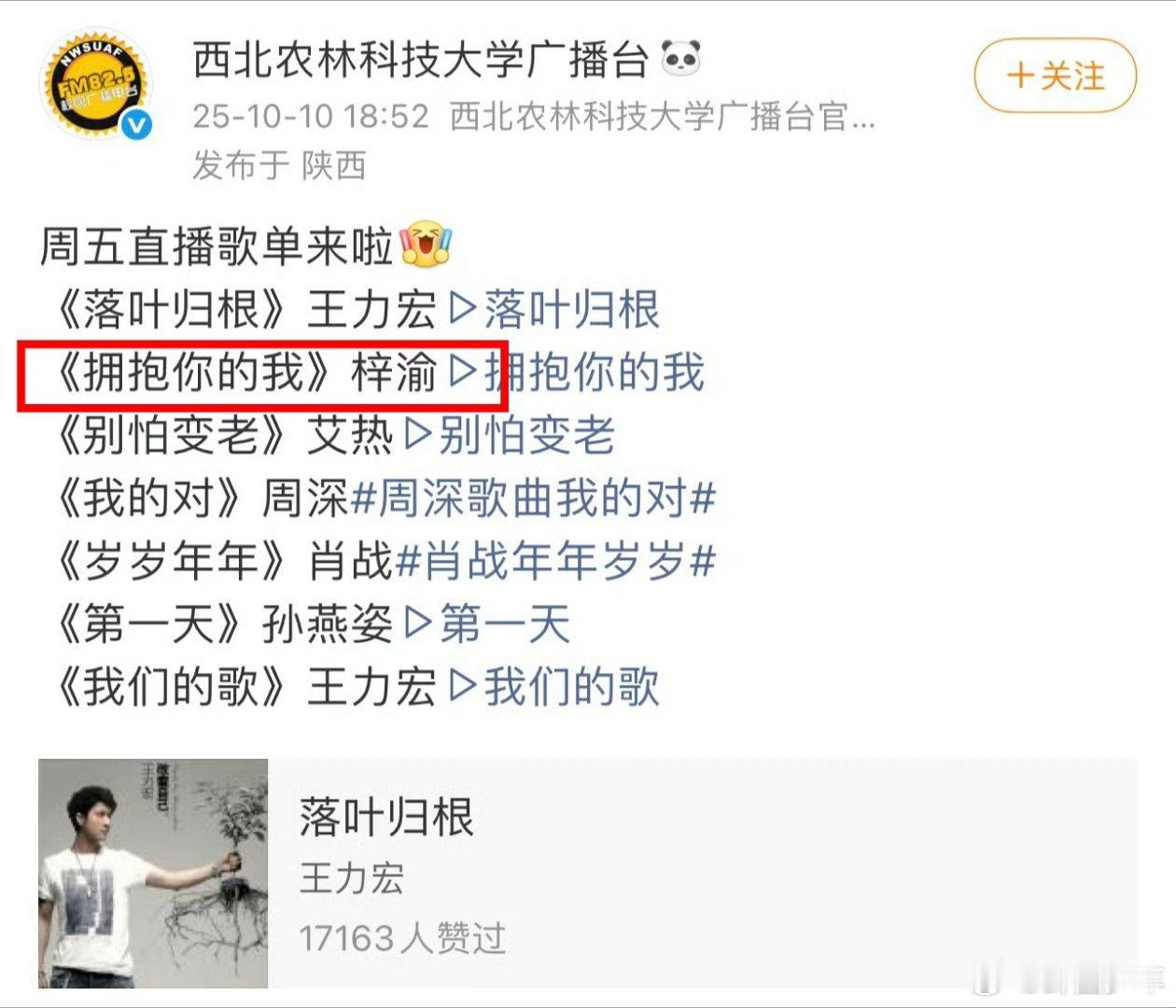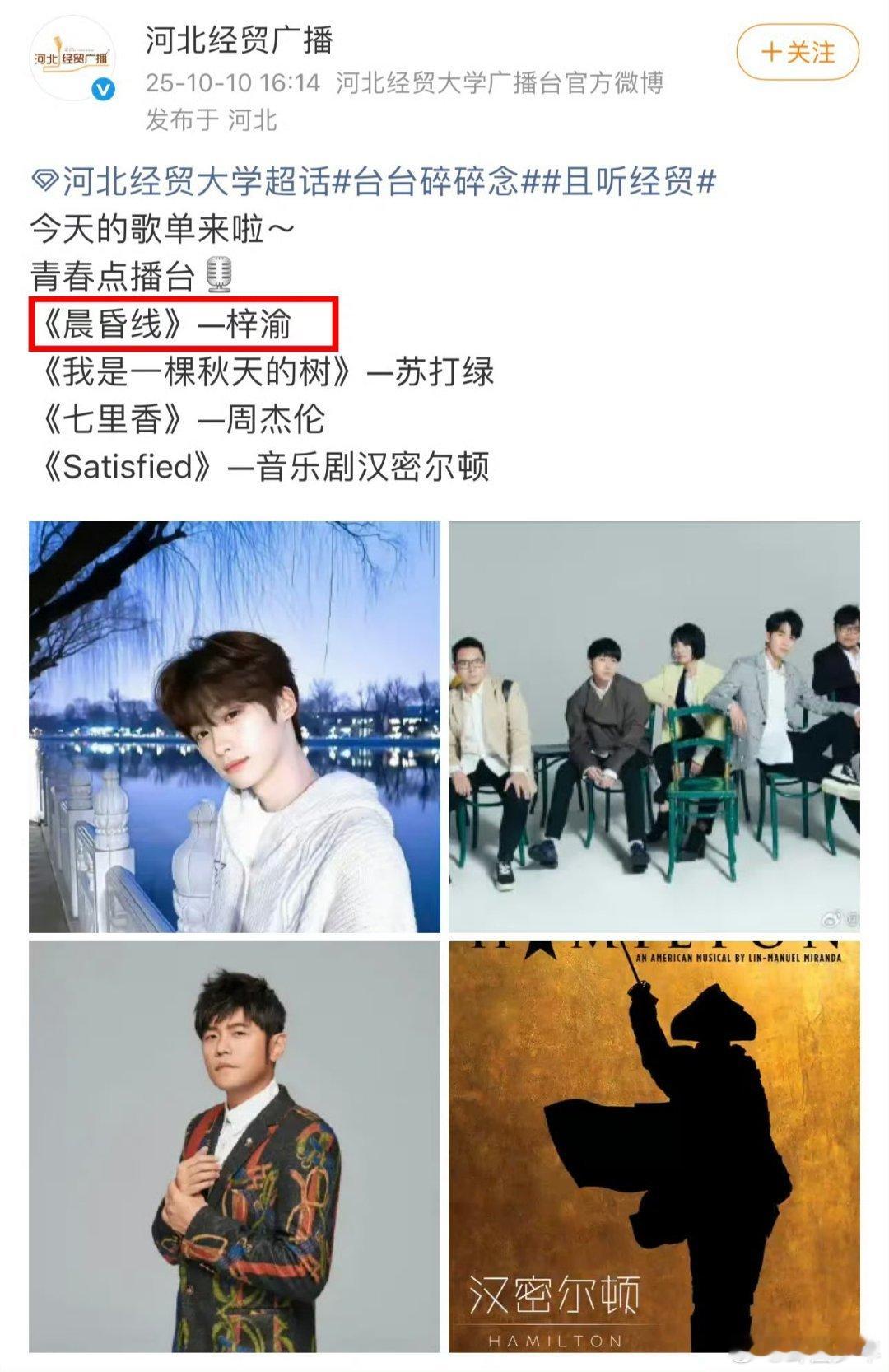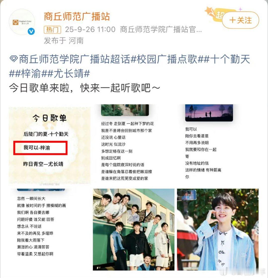 梓渝的歌进入各大高校广播站播放各个高校广播站都在放梓渝的歌 高校广播站的“刷屏式播放”,就是对梓渝音乐最好的认可!没有华丽噱头,全凭歌曲本身的感染力,让每一所校园都成了他的“音乐舞台”。这份来自青春阵地的偏爱,足以证明他的歌有多戳人心!