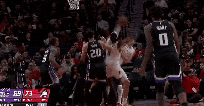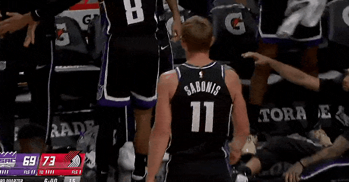 第三节比赛中,萨博尼斯身背5犯下场,格兰特抢下前场板打成2+1。